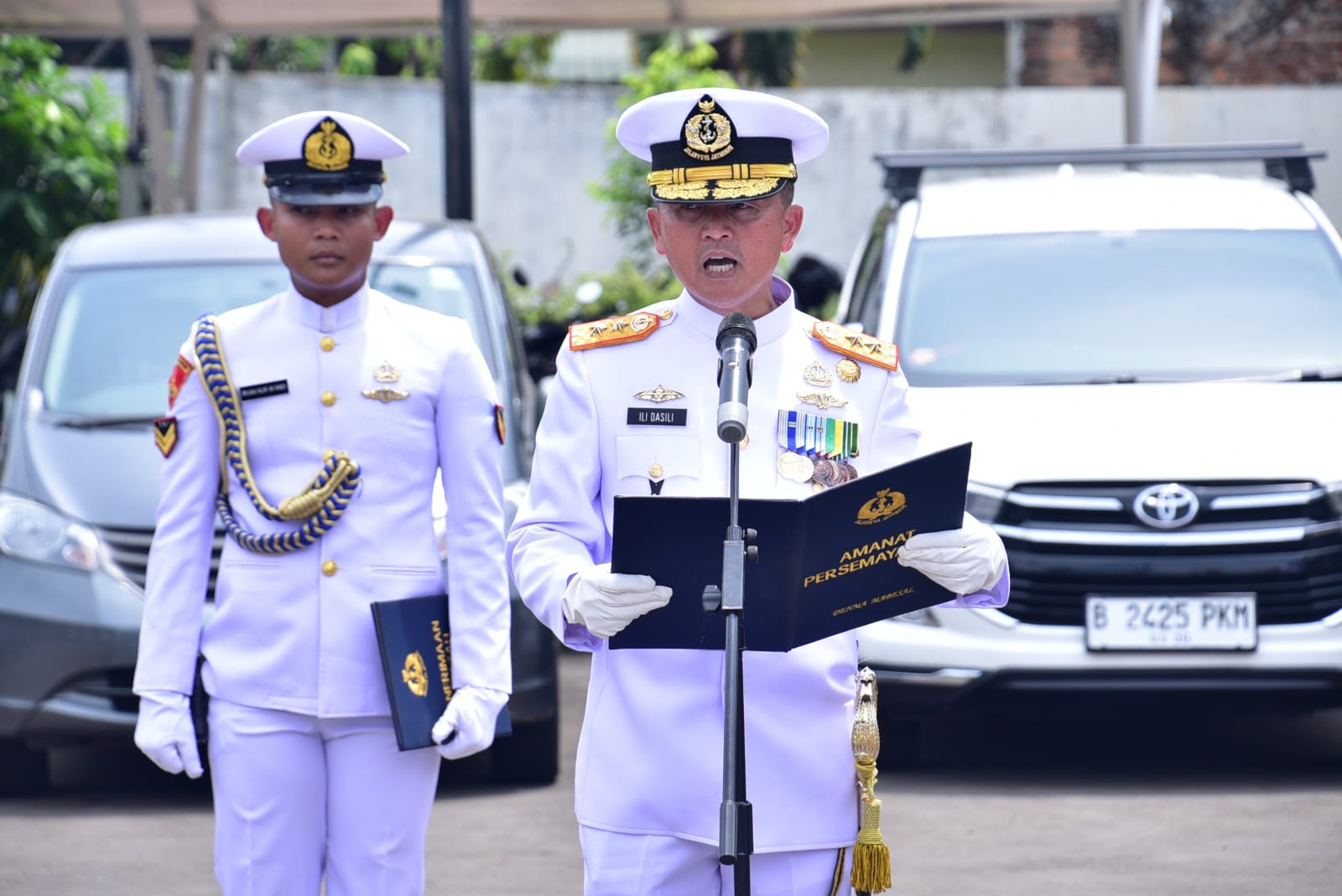 TNI AL, Dispen Kormar, Pasmar 1 (Jakarta). Komandan Pasmar 1 (Danpasmar 1) Mayjen TNI (Mar) Ili Dasili, S.E., bertindak sebagai Inspektur Upacara (Irup) pelepasan jenazah dari rumah duka pada pemakaman militer Mayjen TNI Mar (Purn) Purwadi menuju TPU Pangkalan Jati, Pondok Labu, Jakarta Selatan, Jumat (21/11/2025).