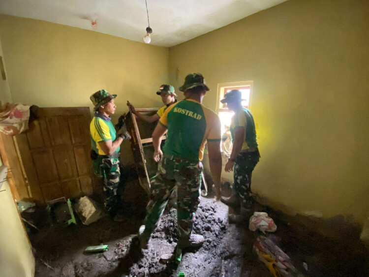OKEBUNG | Batalyon zeni Tempur 10 Kostrad melaksanakan pembersihan rumah warga yang terkena dampak erupsi Gunung Semeru, Kab. Lumajang, Kec. Supiturang. Senin (24/11/2025).
