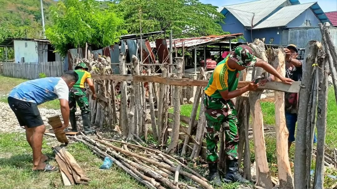 OKEBUNG | Pos Motamasin dan Pos Haslot Satgas Pamtas RI-RDTL Sektor Timur kembali menunjukkan kepeduliannya terhadap pembangunan fasilitas keagamaan di wilayah perbatasan. Personel dari kedua pos melaksanakan kegiatan karya bakti di Gereja GMIT Jemaat Moria Wemasa, Desa Raihenek, Kecamatan Kobalima Timur, Kabupaten Malaka. Kegiatan ini disambut hangat oleh para jemaat dan masyarakat sekitar yang turut mendukung secara langsung.