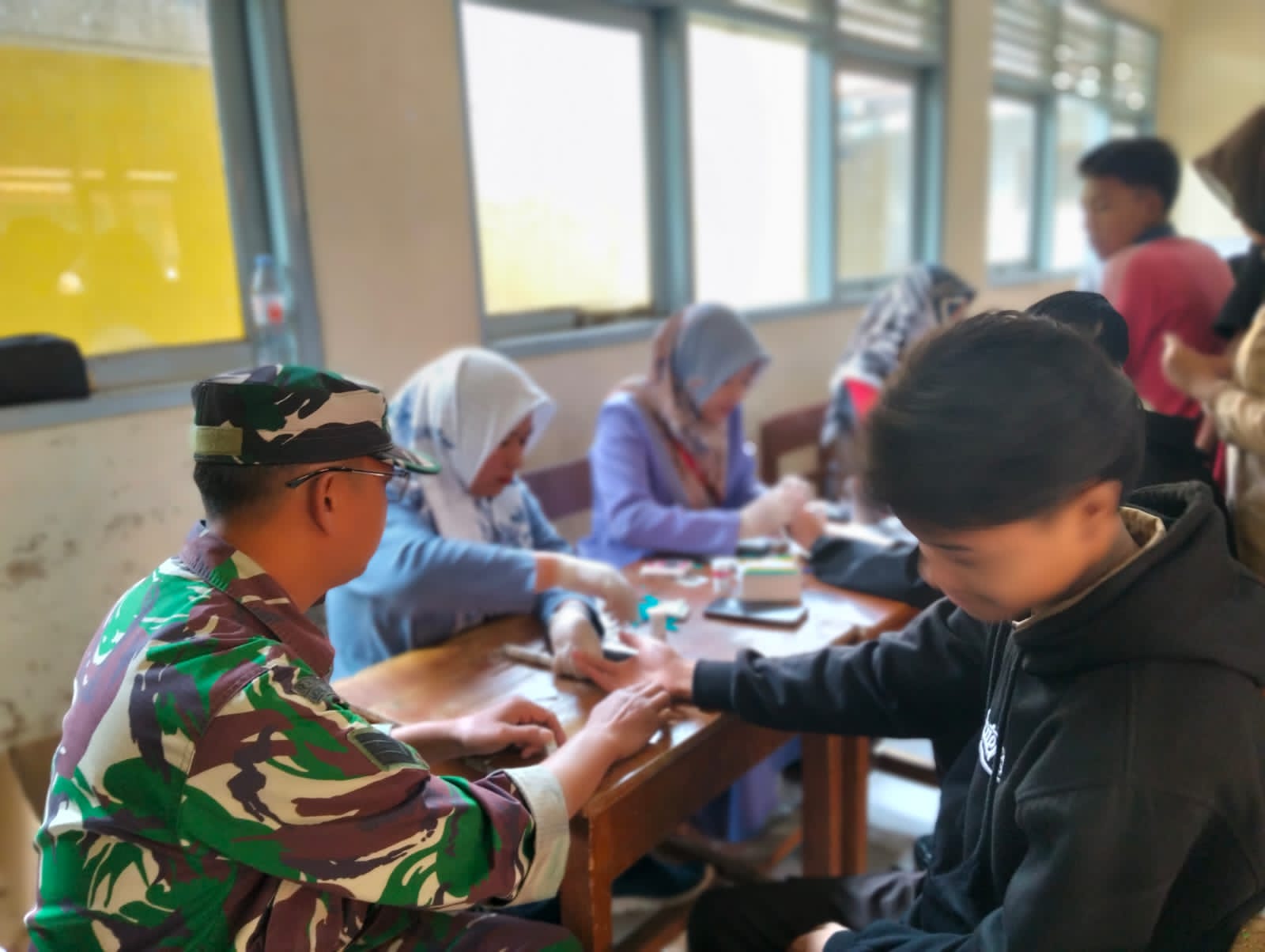 Boyolali — Babinsa Koramil 07/Selo Kodim 0724/Boyolali, Serka Sudarsono, turut mendampingi pelaksanaan skrining kesehatan bagi siswa-siswi SMK I Selo, Kecamatan Selo, Kabupaten Boyolali, Selasa (25/11/25).