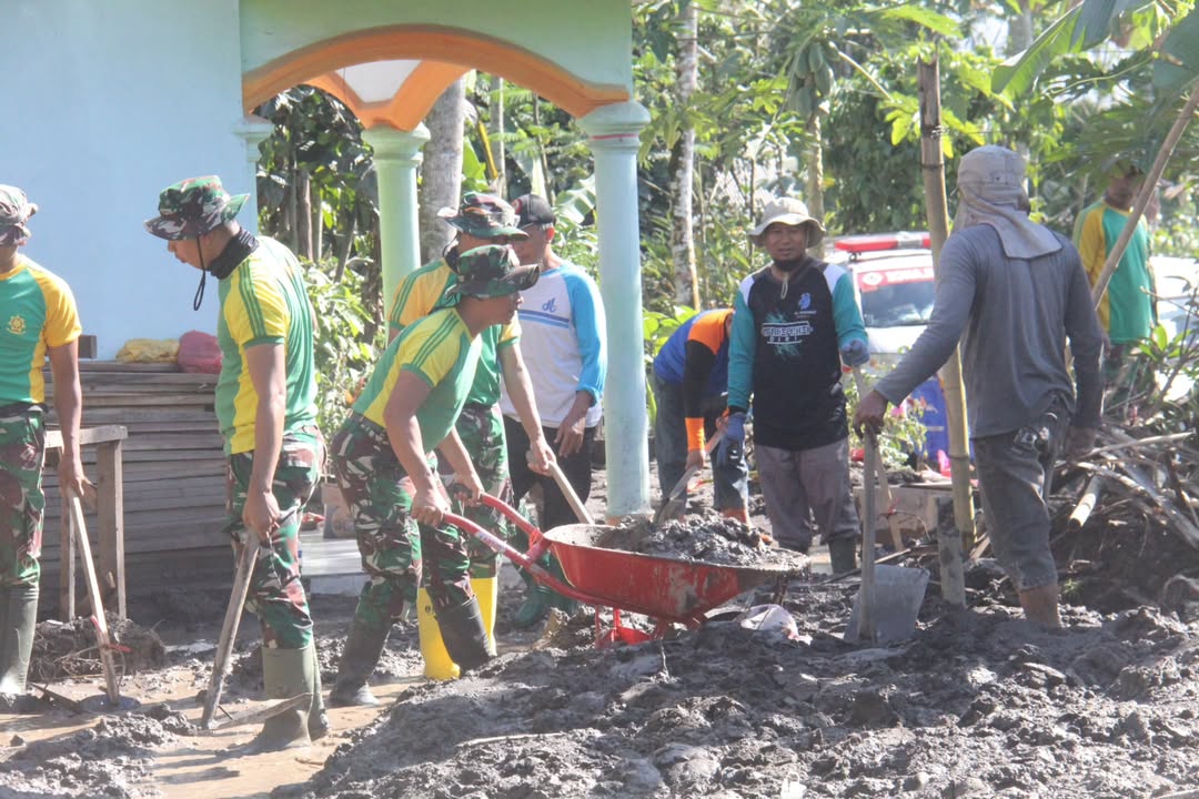 Lumajang – Prajurit TNI, warga dan relawan masih berjibaku dengan lumpur yang menutupi rumah warga di Desa Supiturang, Kecamatan Pronojiwo, pasca erupsi Gunung Semeru. Dengan penuh semangat, mereka bahu-membahu membersihkan material vulkanik yang menghambat aktivitas masyarakat. Lumajang (25/11/2025).