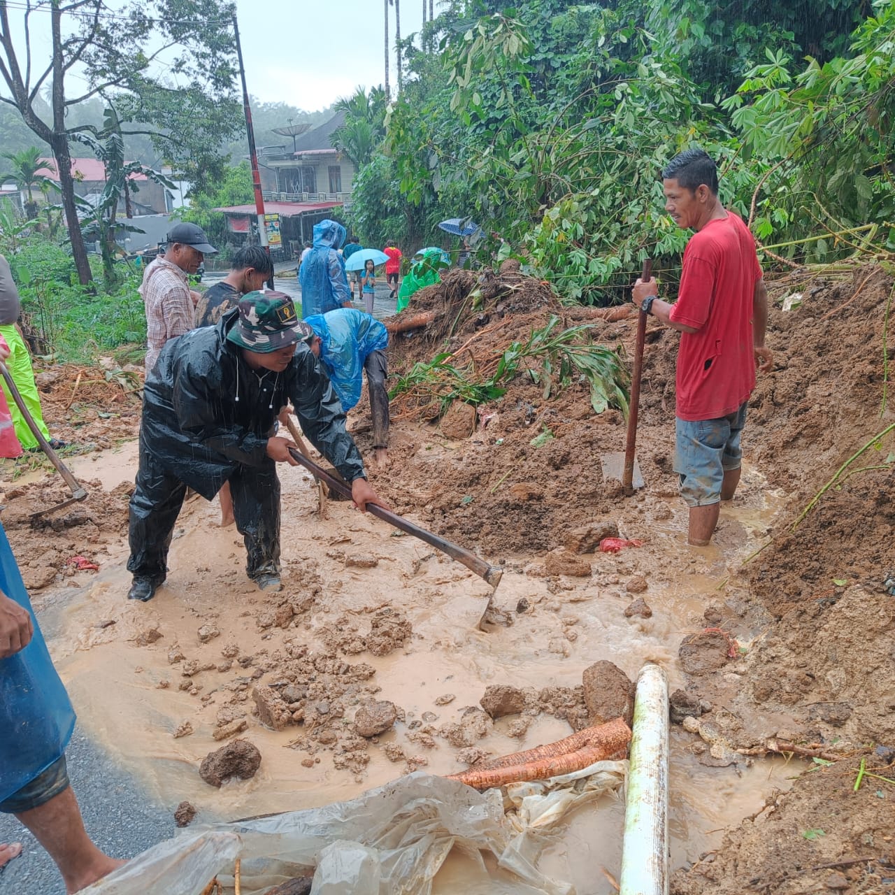 Mengetahui kejadian tersebut, Babinsa Koramil 08/Sungai Geringging bersama Bhabinkamtibmas, Wali Nagari, Wali Korong, Damkar Kecamatan Sungai Geringging, serta warga setempat segera turun ke lokasi. Mereka melakukan pembersihan material longsor secara bergotong royong untuk membuka kembali akses jalan bagi masyarakat.