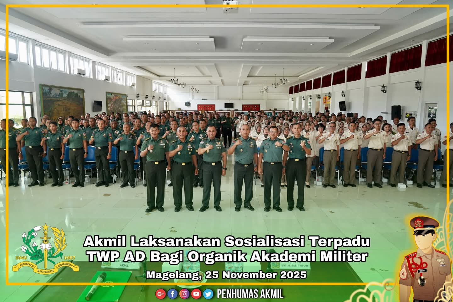 Magelang– Akademi Militer melaksanakan kegiatan Sosialisasi Terpadu Tabungan Wajib Perumahan Angkatan Darat (TWP AD) bagi seluruh organik Akademi Militer, bertempat di Gedung Moch Lily Rochli Akmil. Kegiatan ini menghadirkan Brigjen TNI Aloysius Agung Widi W., S.H., M.H., selaku pemateri bersama tim TWP AD. Kegiatan tersebut diikuti para pejabat distribusi dan organik Akmil sebagai peserta sosialisasi.