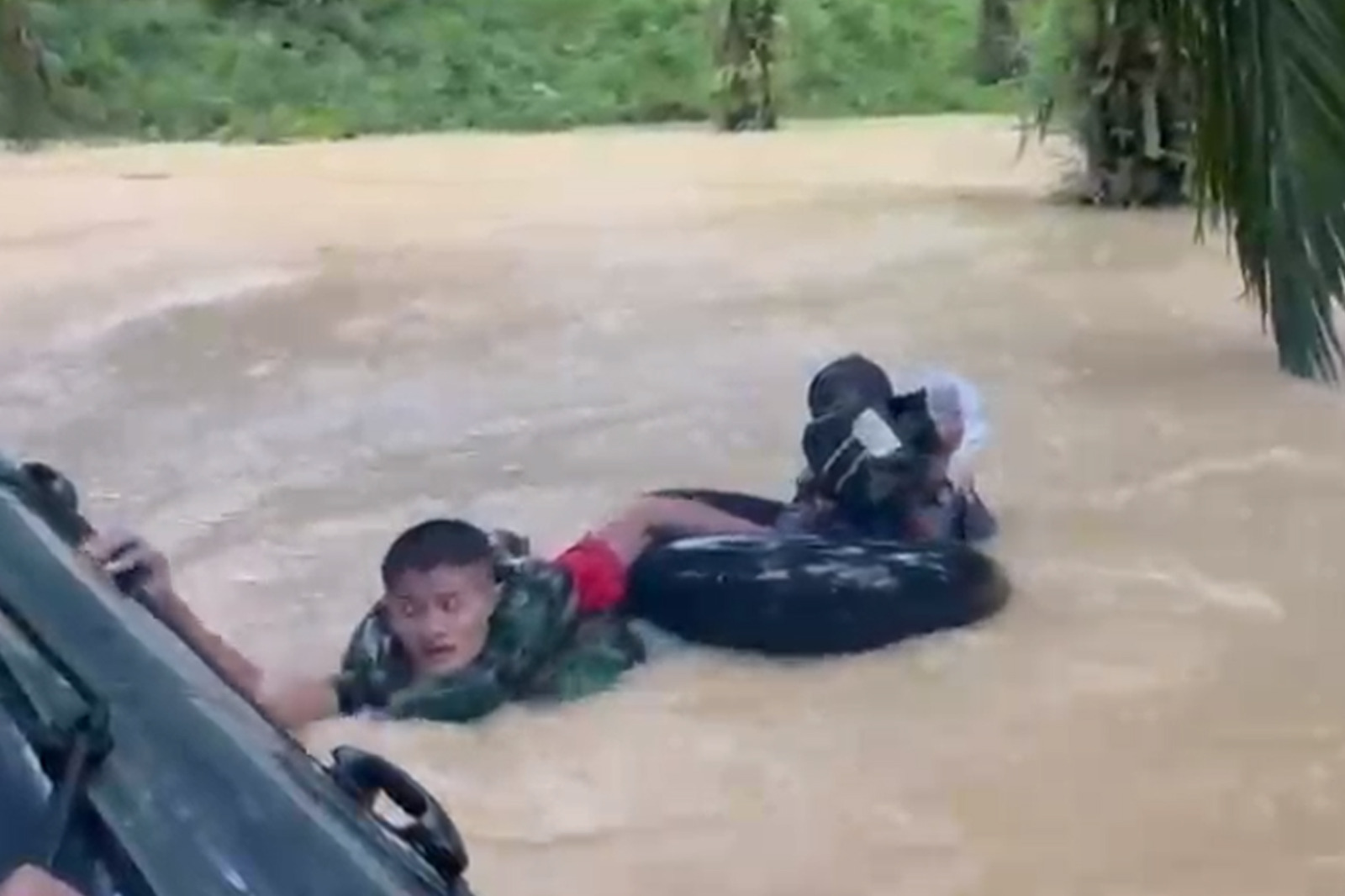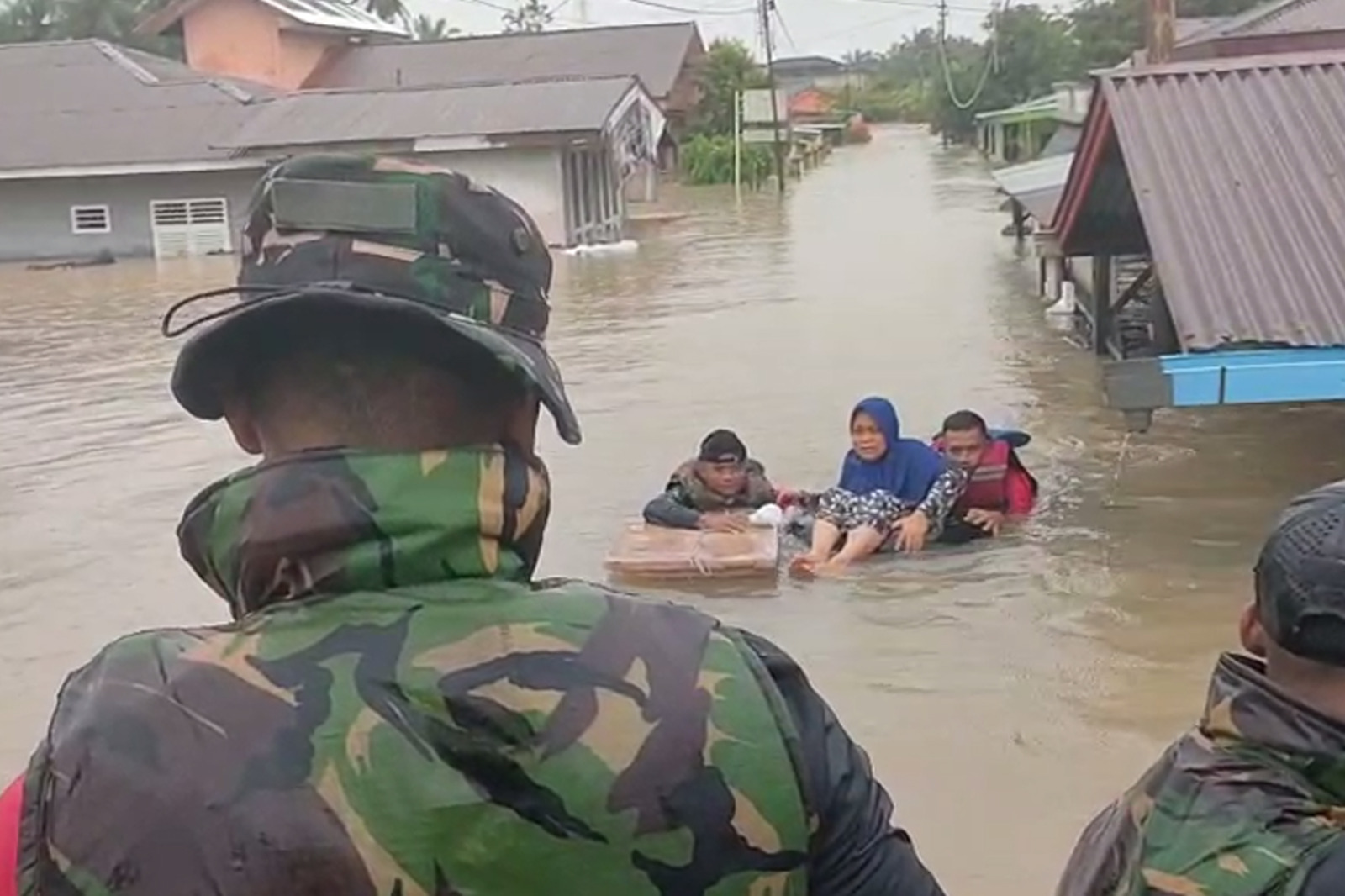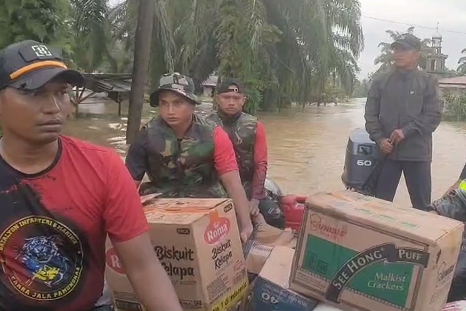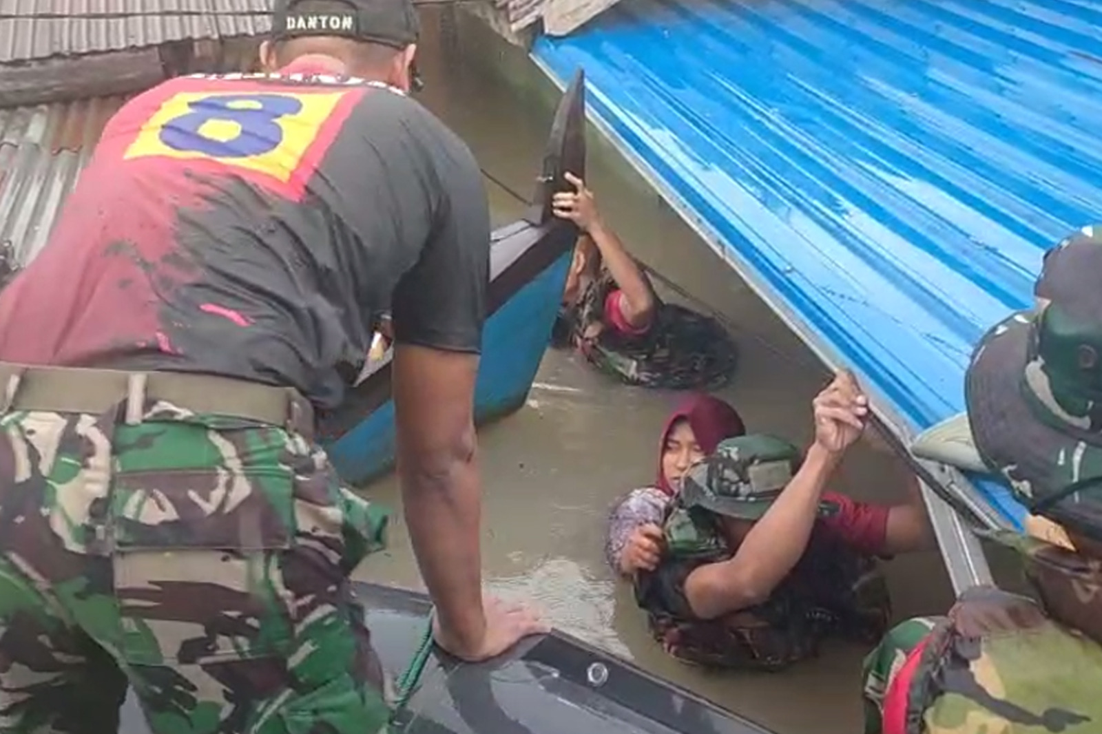 Prajurit Batalyon Infanteri 8 Marinir melaksanakan evakuasi secara cepat dengan menggunakan perahu karet menyusuri arus deras. Mereka menjemput warga yang terjebak di dalam rumah, di atap bangunan, hingga yang bertahan di atas pohon. Upaya berisiko tinggi ini berhasil menyelamatkan puluhan warga termasuk anak-anak dan lansia, meski medan licin serta potensi longsor susulan terus mengancam.
