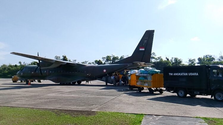 Pesawat CN-295 Skadron Udara 2 turut mengangkut 20 drum BBM, 780 kg beras, dan 15 karton air mineral sebagai dukungan vital untuk kelancaran operasional di lapangan, termasuk mobilisasi distribusi dan kebutuhan dapur umum bagi para penyintas.
