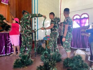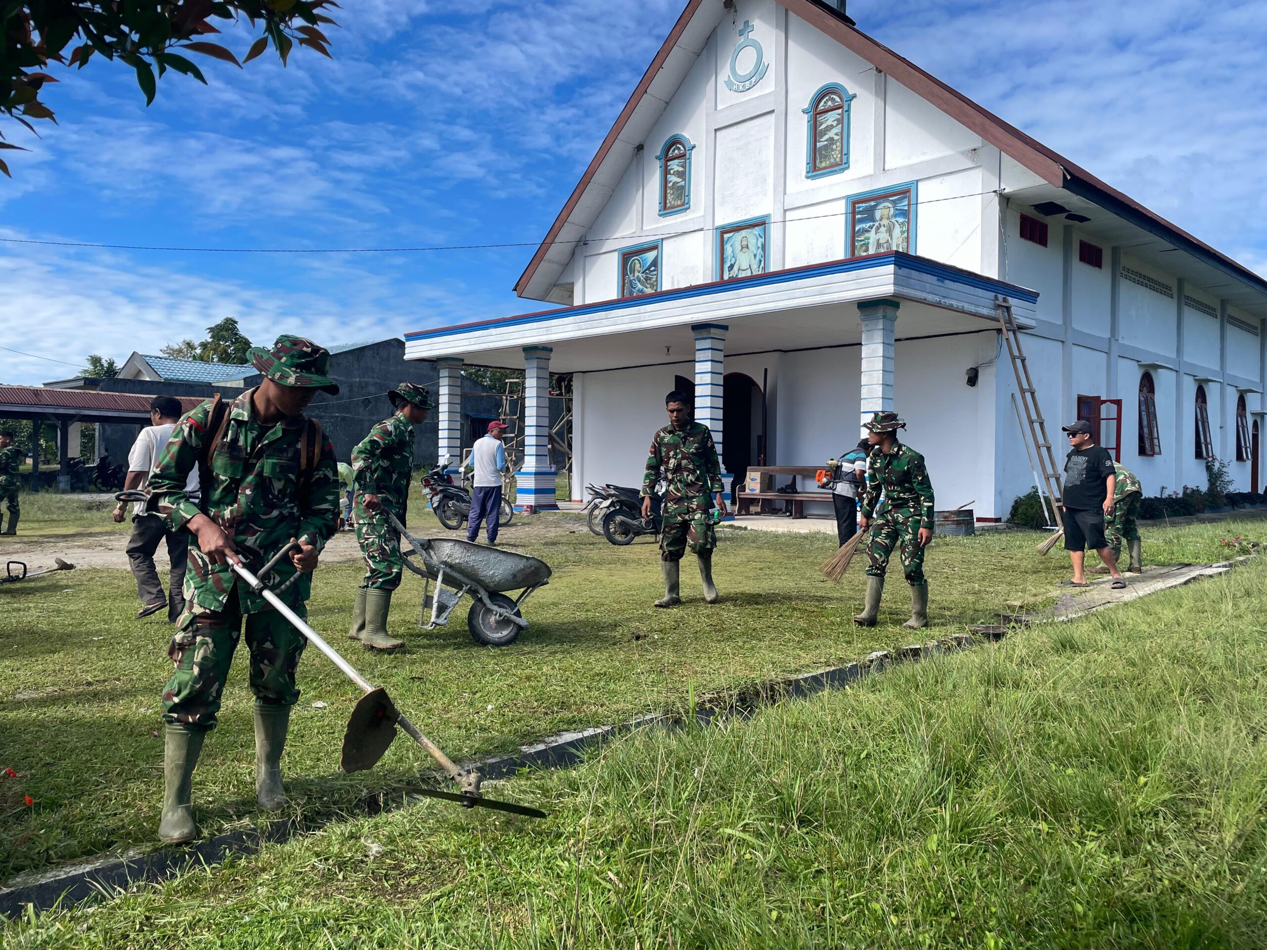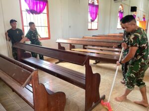 Proses kerja bakti dimulai sejak pagi dengan pembersihan halaman gereja menggunakan mesin pemotong rumput, peralatan kebersihan manual, serta penataan bunga di area taman sekitar gereja. Tidak hanya bagian luar, para prajurit dan warga juga menata kebersihan ruangan dalam gereja, membersihkan sawang-sawang di langit-langit, mengangkat debu pada bangku jemaat, dan merapikan area altar. Hasilnya, rumah ibadah terlihat lebih rapi, nyaman, dan tertata indah sebagai ruang sakral bagi umat yang beribadah.