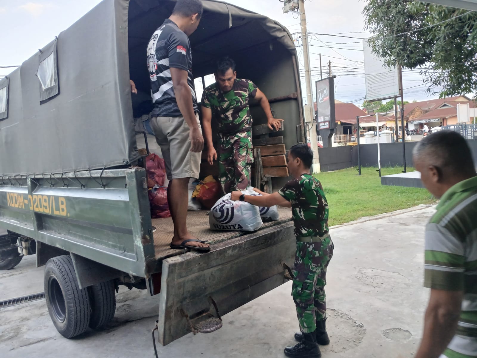 Bantuan yang dikumpulkan di Kantor Koramil kemudian di antar dan di kumpulkan di Makodim untuk di antar ke Kodam I/BB yang selanjutnya akan didistribusikan ke daerah terdampak.
