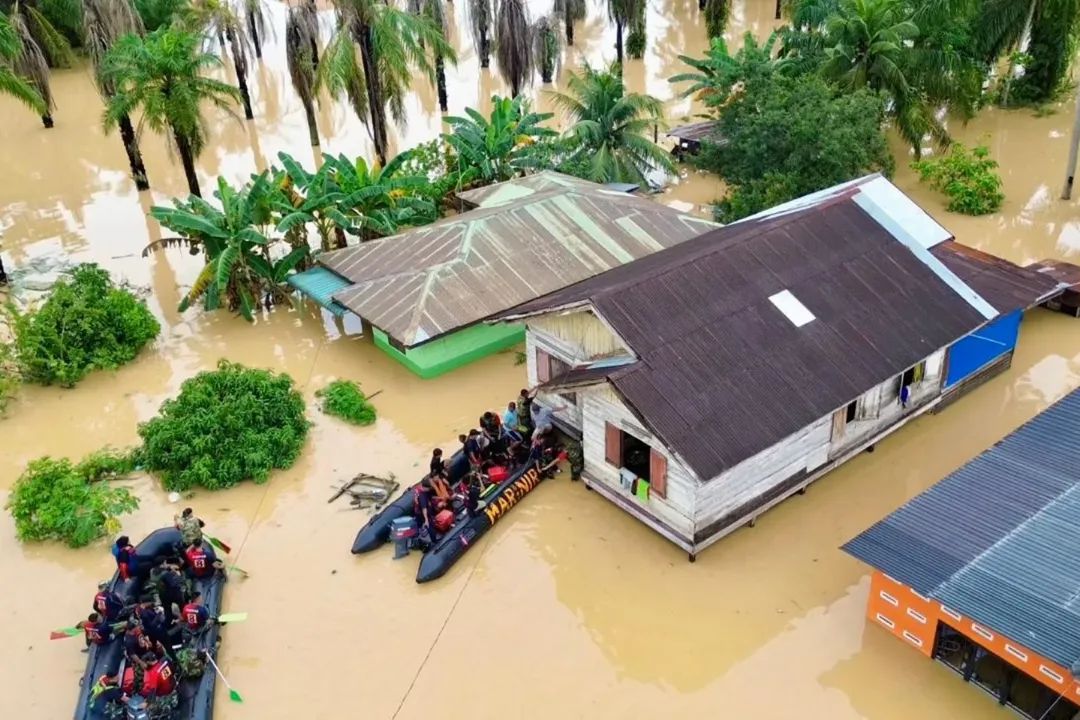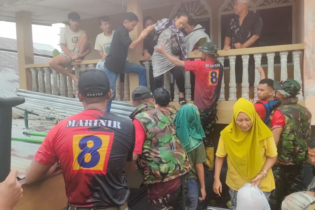 Di sebuah rumah panggung yang hampir seluruhnya terendam, warga yang menunggu pertolongan akhirnya dapat dievakuasi setelah perahu karet Marinir merapat secara bergantian. Proses evakuasi dilakukan berulang hingga seluruh warga—termasuk ibu-ibu dan anak-anak—berhasil dipindahkan ke daerah yang lebih aman.