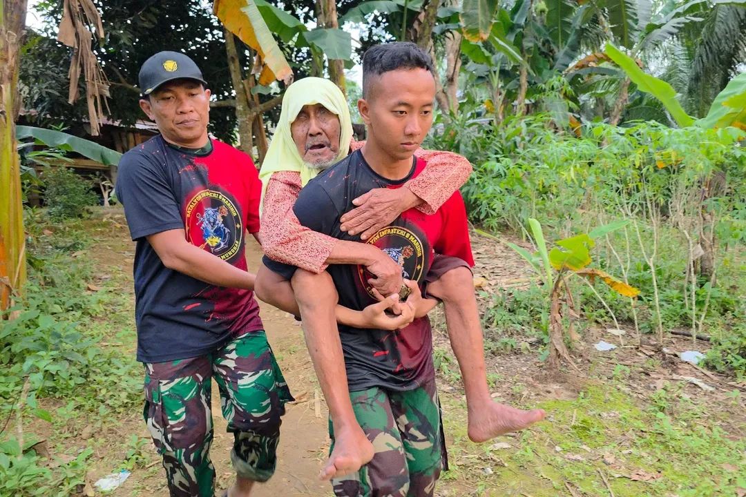 Pada titik lain, seorang kakek lansia juga berhasil dievakuasi. Prajurit menggendong korban melewati jalan berlumpur menuju lokasi aman. Penyisiran dilakukan dari rumah ke rumah untuk memastikan tidak ada warga tertinggal, terutama warga lanjut usia yang kesulitan menyelamatkan diri.