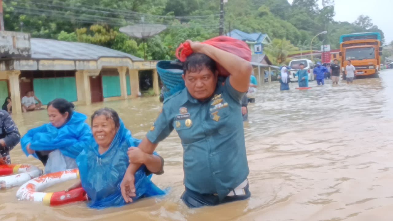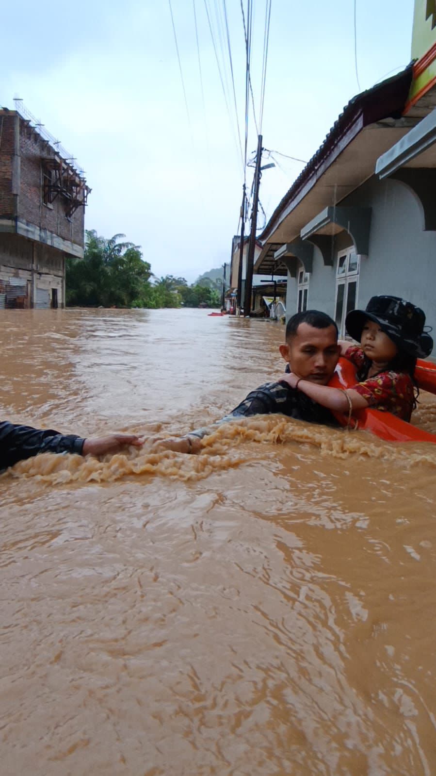 Di lokasi berbeda, dua prajurit Lanal Sibolga lainnya, Lettu Laut (PM) Desmulyadi dan Kld Bek Rahut Naibaho, menyusuri banjir yang kian tinggi demi menjangkau seorang balita yang terjebak di dalam rumahnya. Dengan perlengkapan terbatas, keduanya berhasil mengevakuasi balita tersebut ke tempat aman, menunjukkan kesigapan dan keberanian prajurit TNI AL dalam kondisi darurat.