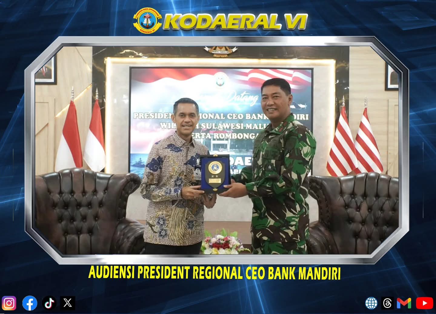 Makassar, Komandan Komando Daerah Angkatan Laut (Dankodaeral) VI Laksamana Muda TNI Andi Abdul Aziz, S. H., M.M. yang di Wakilli Wadan Kodaeral VI Laksamana Pertama TNI Dr. Arya Delano, S.E., M.Pd., M.Han. menerima audiensi President Regional CEO Bank Mandiri Wilayah Sulawesi Selatan Maluku Bapak Atta Alva Wanggai di Longroom Macan Kumbang Mako Kodaeral VI, Rabu (03/12/2025).