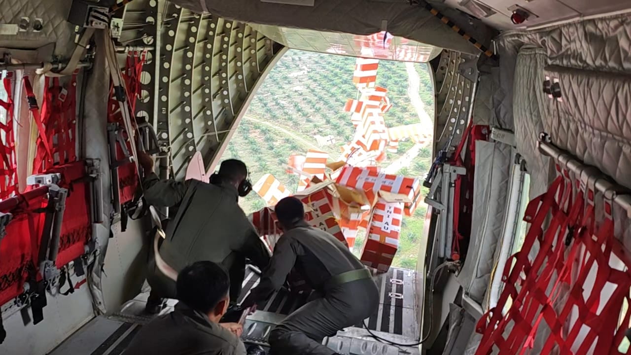 Pengiriman logistik dari udara dilakukan untuk menjangkau wilayah-wilayah terisolasi yang sulit ditembus melalui jalur darat akibat akses yang terputus. Personel TNI memastikan seluruh paket bantuan diturunkan secara akurat pada titik-titik yang telah dipetakan sebelumnya, sehingga dapat segera dimanfaatkan oleh masyarakat terdampak.