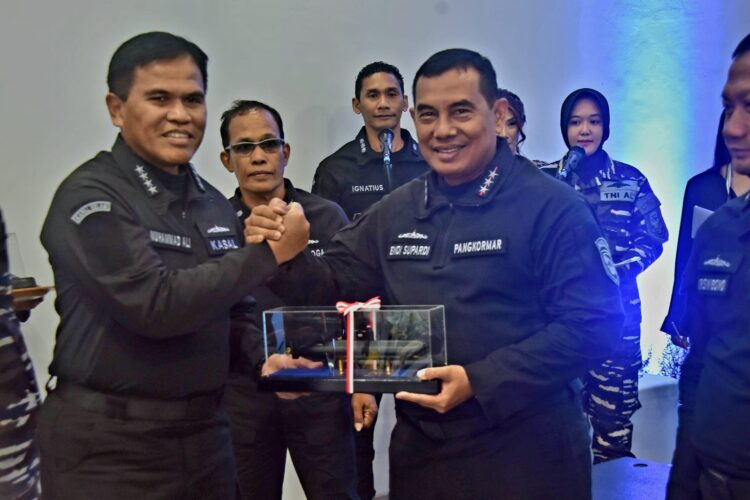 Dispen Kormar TNI Angkatan Laut (Surabaya). Panglima Korps Marinir (Pangkormar) Letnan Jenderal TNI (Mar) Dr. Endi Supardi, S.E., M.M., M.Tr.Opsla., CHRMP., CRMP., menerima Brevet Kehormatan Hiu Kencana yang disematkan langsung oleh Kepala Staf Angkatan Laut (Kasal) Laksamana TNI Dr. Muhammad Ali, S.E., M.M., M.Tr.Opsla. Penyematan berlangsung di dalam KRI Nagapasa-403 yang bersandar di Dermaga Madura, Koarmada II, Surabaya, Kamis (04/12/2025).