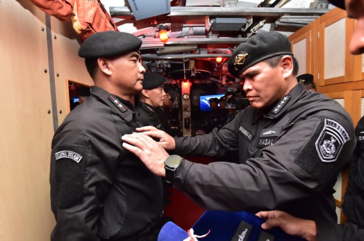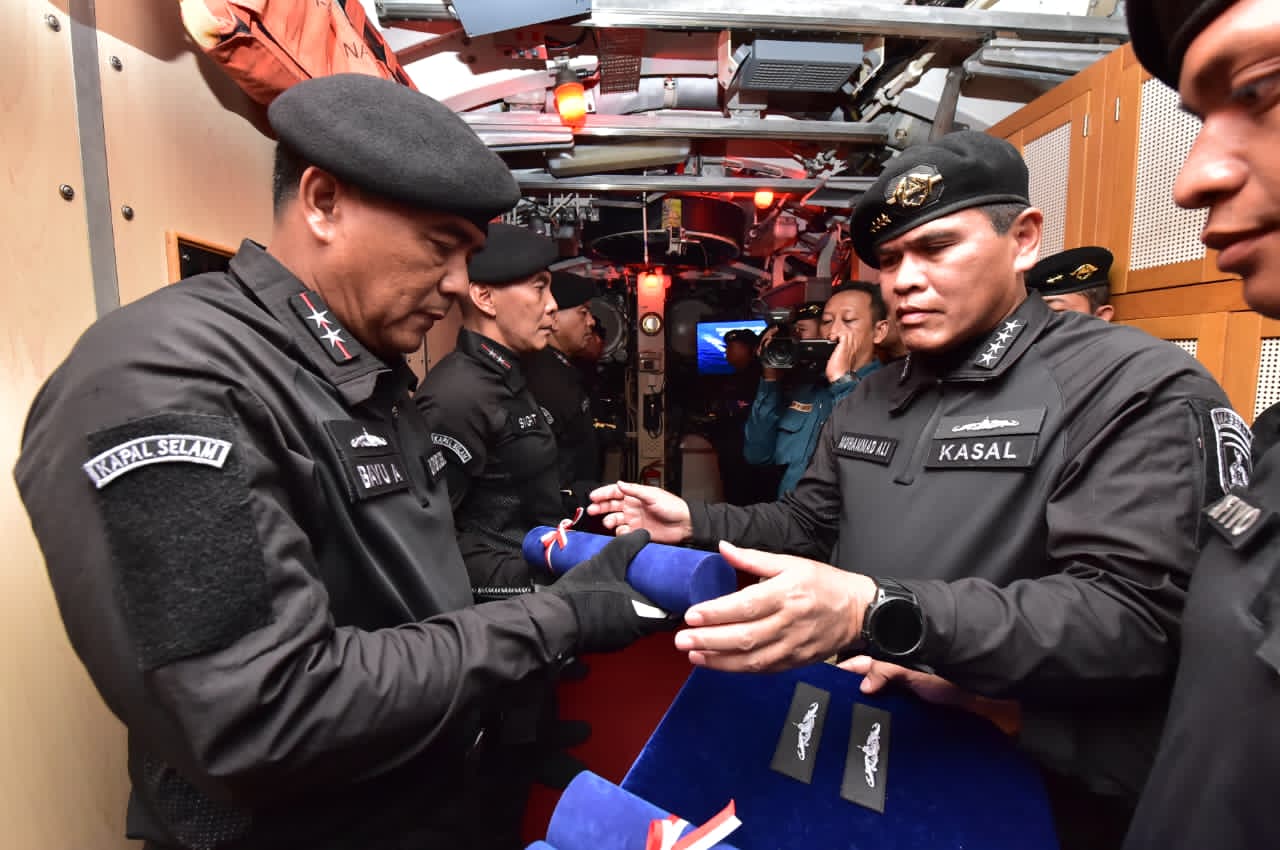 Komandan Pusat Penerbangan TNl Angkatan Laut (Danpuspenerbal), Laksda TNl Bayu Alisyahbana menerima Brevet Kehormatan Hiu Kencana dari Kepala Staf Angkatan Laut (Kasal), Laksamana TNI Dr. Muhammad Ali di dalam Kapal Perang Republik Indonesia (KRI) Nagapasa-403 yang bertolak dari Dermaga Madura Koarmada II, Surabaya,Rabu (4/12/2025).