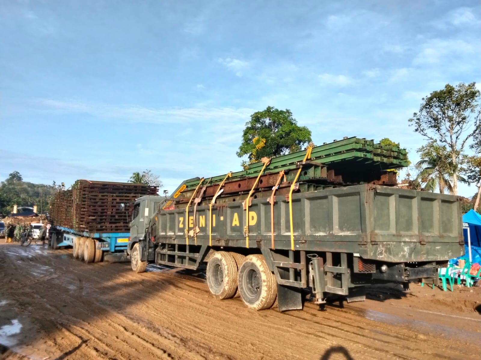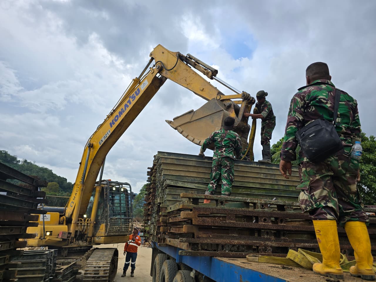 Upaya pemulihan dilakukan dengan mengerahkan personel Yonzipur I/DD serta dukungan alat berat berupa crane dan excavator untuk menata komponen jembatan darurat di lokasi. Pemasangan dikebut mengingat jalur tersebut menjadi akses vital bagi warga dua kabupaten.