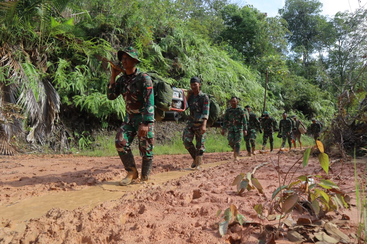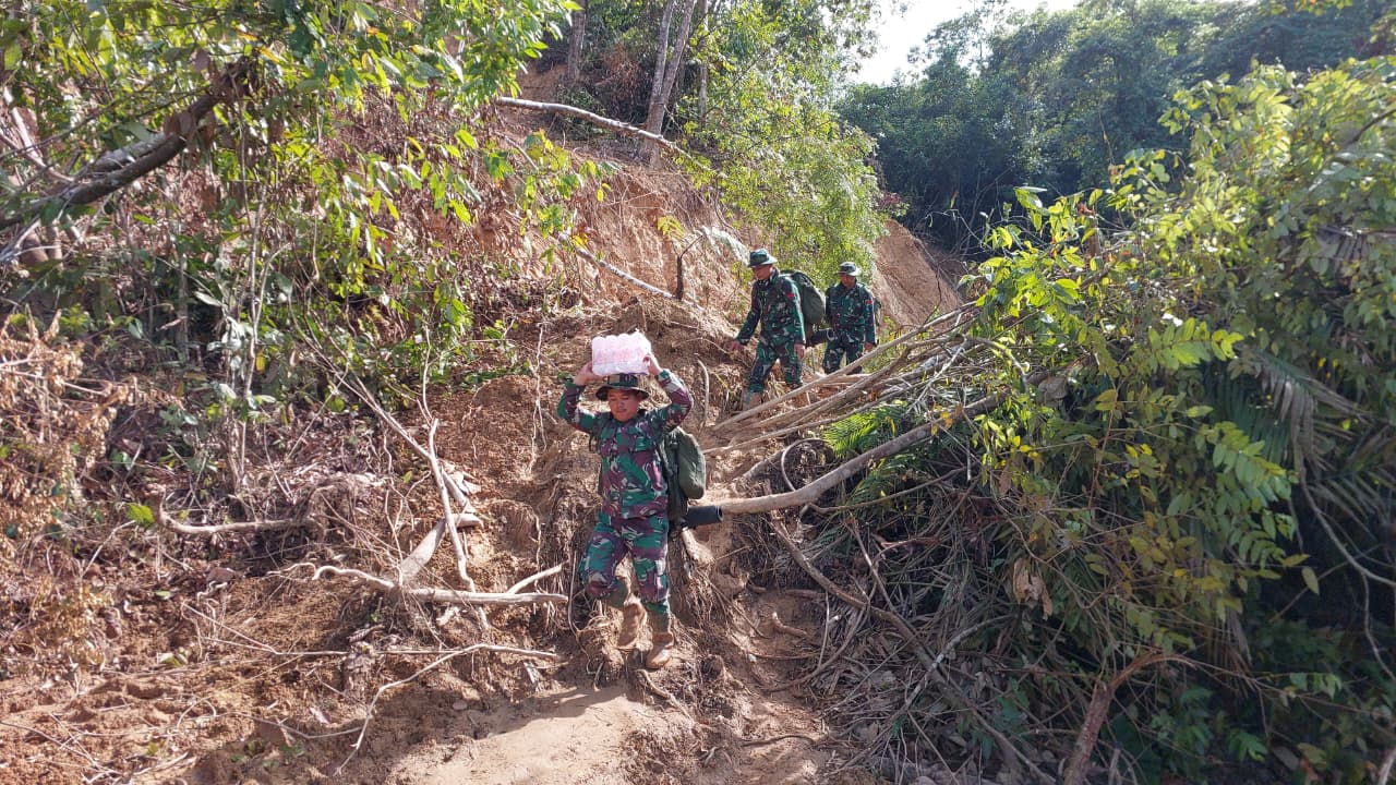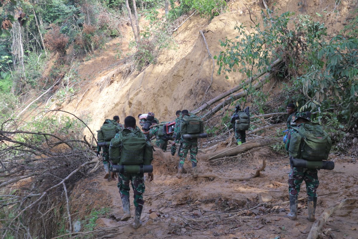 Tapanuli Tengah – Pendorongan logistik dari Yonif 122/TS dan Yonif 125/Simbisa sebanyak 40 orang melaksanakan pergerakan dengan berjalan kaki menuju Dusun Lapan Lombu, Kelurahan Nauli, Kecamatan Sitahuis, Kabupaten Tapanuli Tengah, Sumatera Utara. Sabtu (6/12/2025).