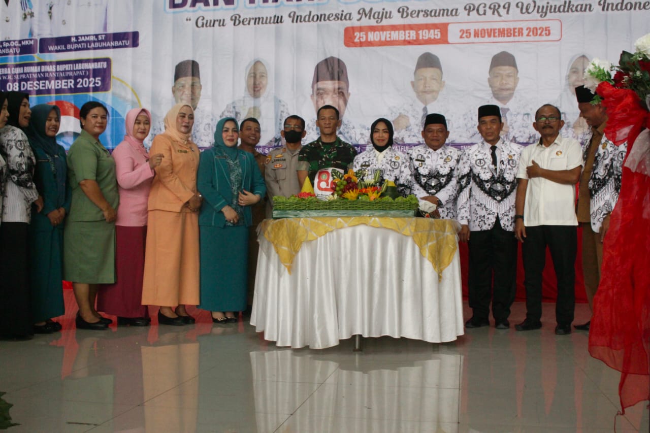 Labuhanbatu – Resepsi Hari Ulang Tahun (HUT) ke-80 Persatuan Guru Republik Indonesia (PGRI) sekaligus peringatan Hari Guru Nasional (HGN) Tahun 2025 digelar dengan khidmat di Aula Serbaguna Rumah Dinas Bupati Labuhanbatu, Senin (08/12). Kegiatan yang dihadiri sekitar 1.000 peserta ini turut dihadiri jajaran Forkopimda, termasuk Dandim 0209/Labuhanbatu, Letkol Inf Yudi Ardiyan Saputro, S.IP, sebagai bentuk dukungan TNI terhadap penguatan sektor pendidikan di wilayah Labuhanbatu.