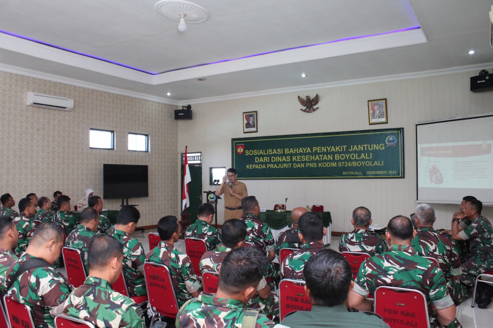 Boyolali – Dalam upaya meningkatkan kesadaran akan pentingnya kesehatan serta pencegahan penyakit tidak menular, khususnya penyakit jantung, Kodim 0724/Boyolali bekerja sama dengan Dinas Kesehatan Kabupaten Boyolali menggelar sosialisasi dan penyuluhan kesehatan tentang bahaya penyakit jantung. Kegiatan ini berlangsung di Aula Makodim 0724/Boyolali, Jalan Padanaran, Desa Tegalmulyo, Kecamatan Mojosongo, Kabupaten Boyolali, Senin (22/12/2025).