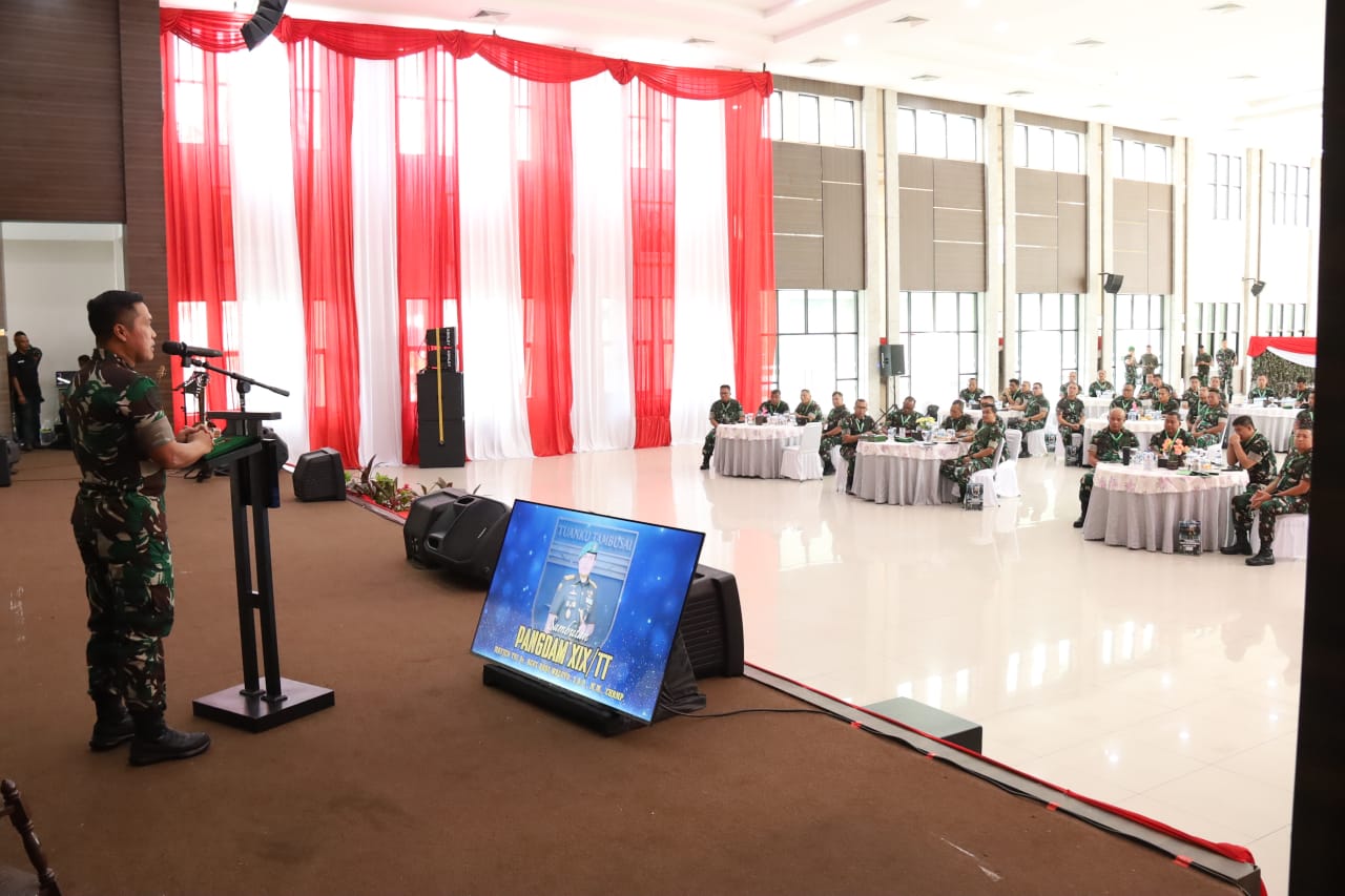 PEKANBARU || Kodam XIX/Tuanku Tambusai menyelenggarakan Rapat Evaluasi Program Kerja dan Anggaran Tahun Anggaran 2025 yang dipimpin langsung oleh Pangdam XIX/Tuanku Tambusai Mayjen TNI Dr. Agus Hadi Waluyo, S.A.P., M.M., CHRMP., serta dihadiri Kasdam, Irdam, Kapoksahli Pangdam, para Pejabat Utama Kodam, Danrem jajaran, para Asisten, Kabalak, dan para Komandan Satuan jajaran Kodam XIX/Tuanku Tambusai.Senin 22/12/25.