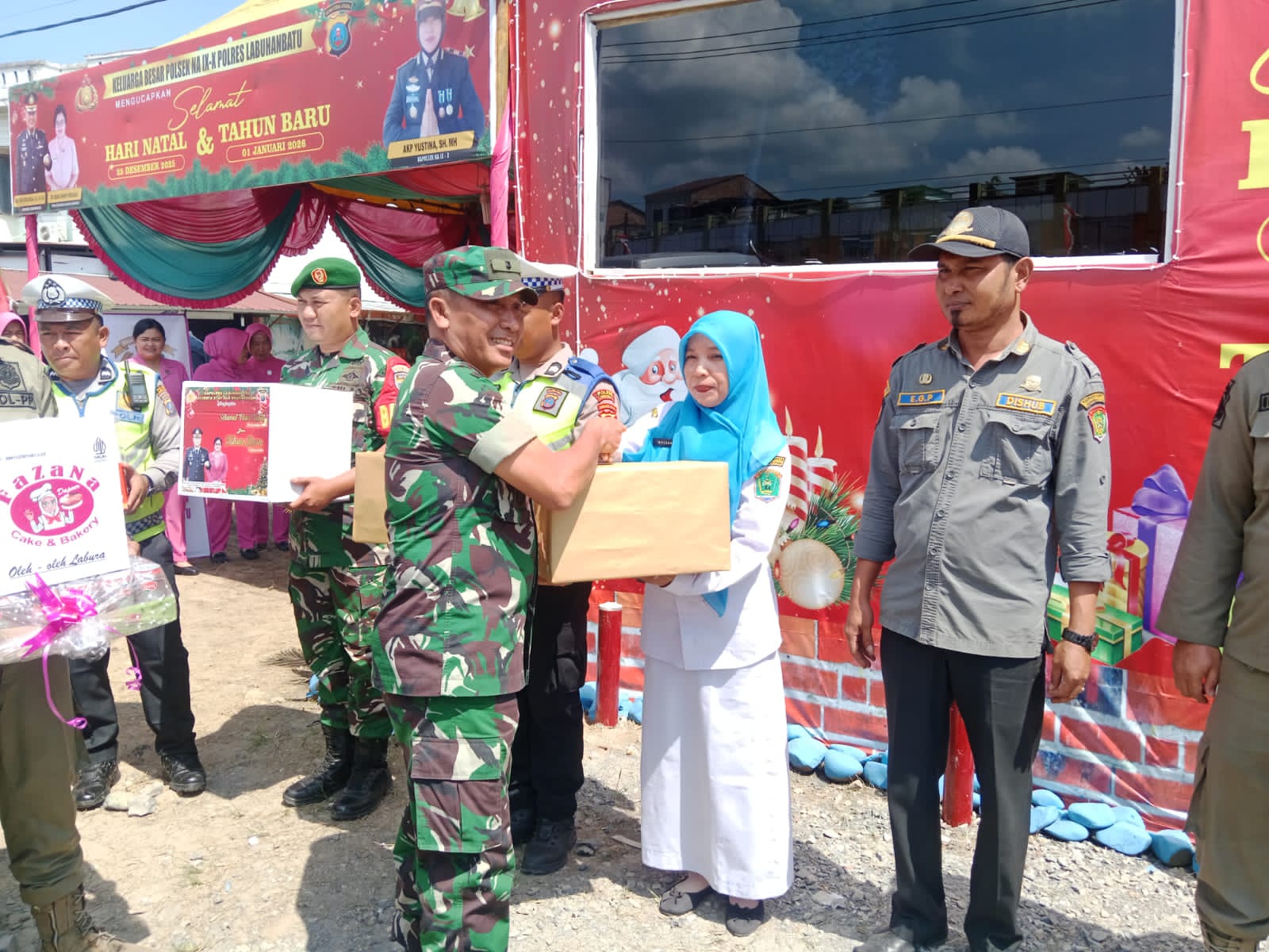 Labuhan batu Utara – Danramil 07/AKB Kapten Arm Dosran M Siregar berserta 2 orang anggota personil lainnya menerima kunjungan Kapolres Labuhanbatu berserta rombongan ke Pos PAM Yan 3 Nataru Tahun 2025 di jalan lintas Desa Kampung Pajak Kecamatan NA-IX-X Kabupaten Labura. Selasa (23/12/2025)