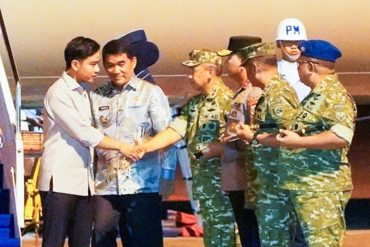 OKEBUNG | Panglima Kodam (Pangdam) XIII/Merdeka, Mayjen TNI Mirza Agus, S.I.P bersama unsur Forkopimda Sulawesi Utara menyambut kedatangan Wakil Presiden Republik Indonesia Gibran Rakabuming Raka di Bandara Internasional Sam Ratulangi, Manado, Sulawesi Utara. Senin (22/12/2025)