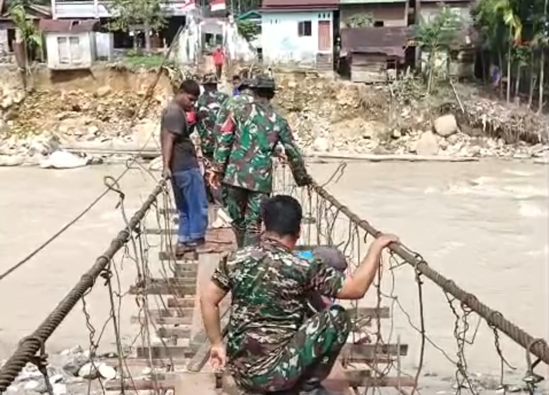 Rusak Akibat Banjir, Prajurit Kodam IM dan Warga Perbaiki Jembatan Gantung di Aceh Tenggara