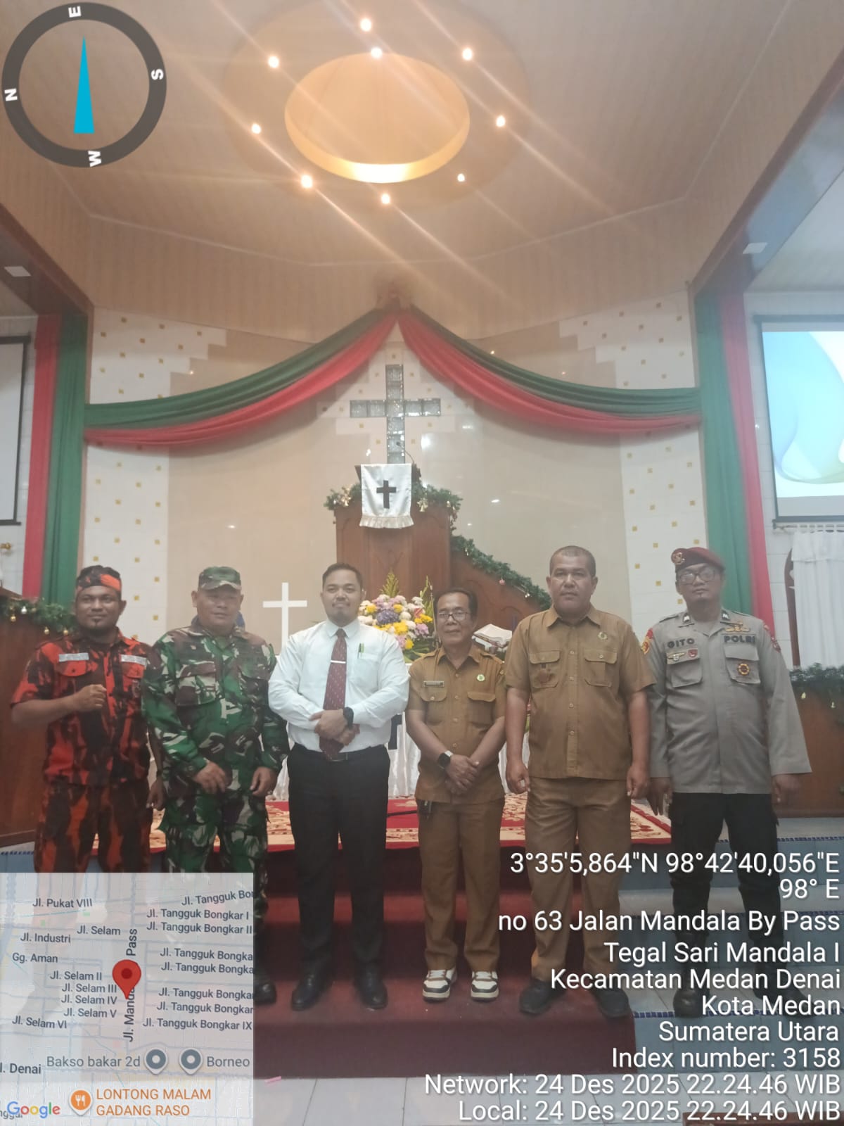 Medan Denai– Dalam rangka memberikan rasa aman dan nyaman kepada umat Kristiani yang melaksanakan ibadah Natal di Tahun 2025, Babinsa Kelurahan Tegal Sari Mandala 1 Koramil 0201-03/ MD An. Serma Mhd Damse Siregar Bersama Polsek Medan Area dan Ormas PP melaksanakan kegiatan pengamanan di gereja HKBP yang berada di wilayah teritorial Koramil 0201-03/ MD Rabu (25/12/2025).