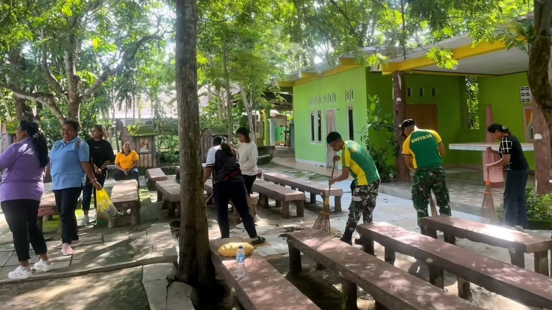 Karya bakti tersebut difokuskan pada pembersihan halaman gereja, termasuk pemangkasan rumput liar dan penataan lingkungan sekitar. Personel Satgas bersama warga setempat bergotong royong menciptakan lingkungan gereja yang bersih, rapi dan nyaman untuk digunakan dalam kegiatan peribadatan.
