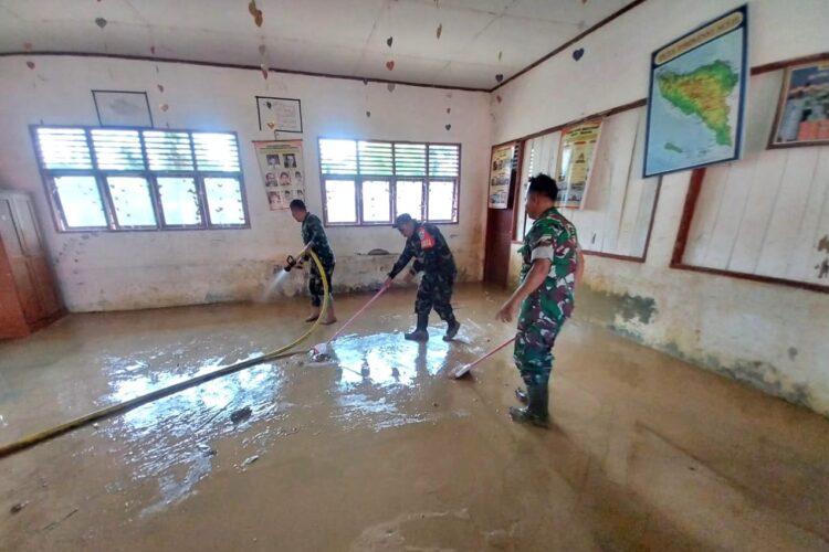 Sejak pagi, personel Babinsa Koramil 09/Seunuddon bersama pihak sekolah bahu membahu membersihkan lingkungan sekolah yang masih dipenuhi lumpur dan sampah sisa banjir.