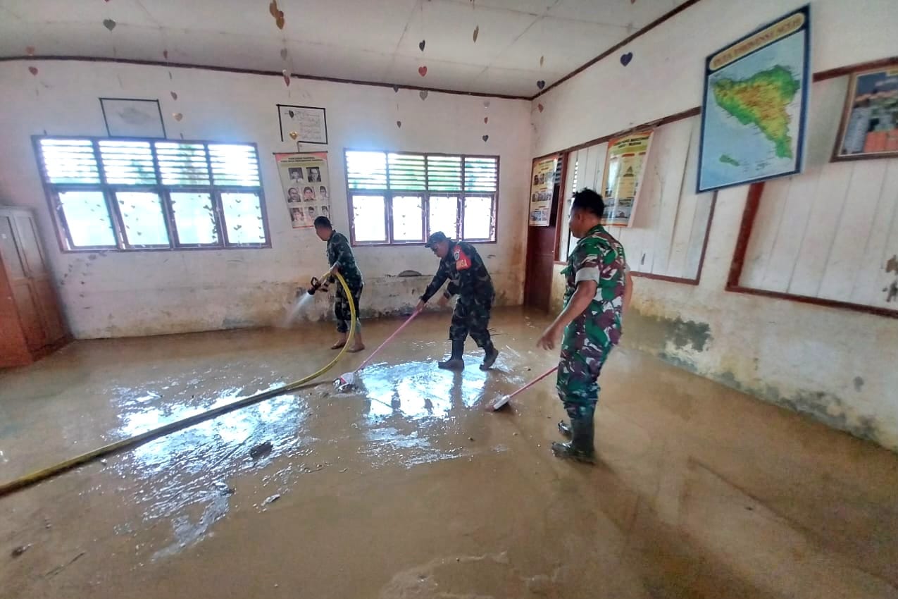 Selain membersihkan lumpur dan sampah, personel TNI bersama para guru juga memindahkan serta merapikan perlengkapan sekolah yang terdampak, sekaligus memilah barang-barang yang masih dapat digunakan.
