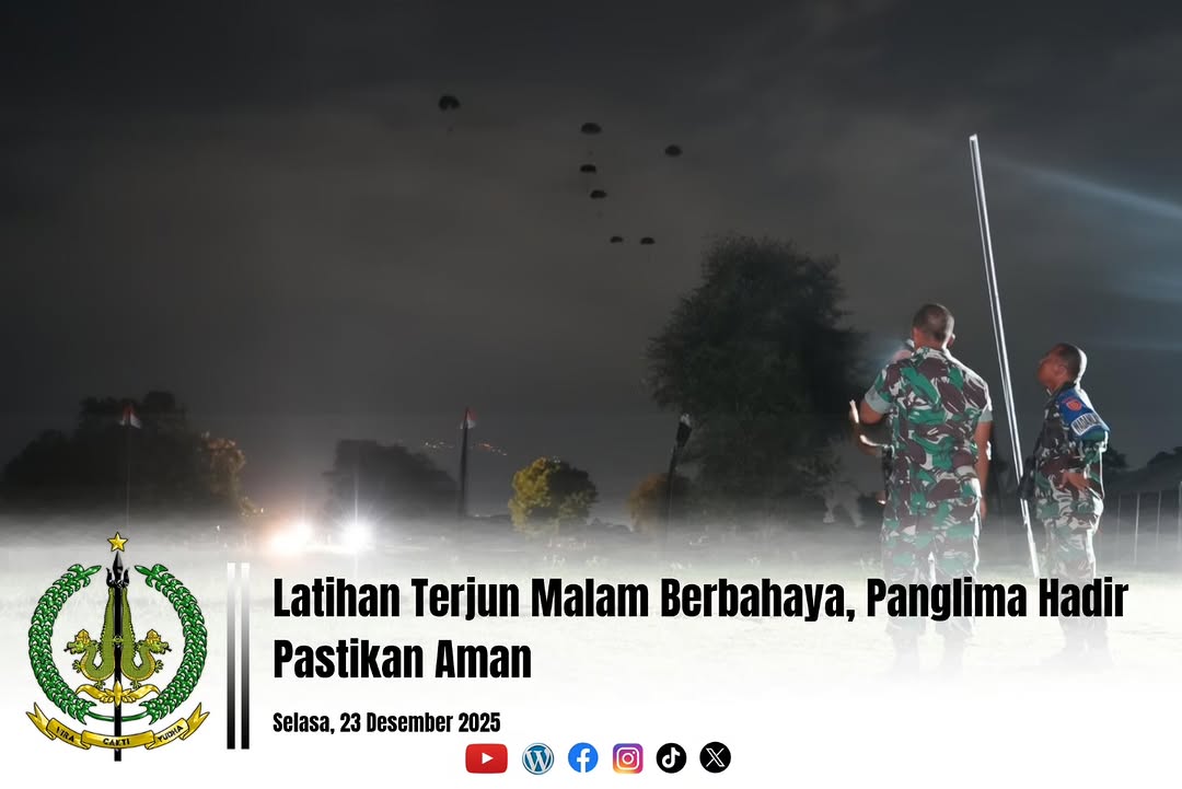 OKEBUNG | Panglima Divisi Infanteri 2 Kostrad, Mayjen TNI Susilo, Irdivif, bersama para Asisten Kasdivif 2 Kostrad, meninjau langsung jalannya latihan terjun Mandiri Satuan Jajaran (Satjar) Divif 2 Kostrad di Grati, Pasuruan. Kehadiran pimpinan di lapangan menjadi bukti nyata perhatian terhadap kesiapan prajurit dalam menguasai kemampuan tempur, khususnya teknik terjun payung yang menuntut keberanian khususnya dimalam hari. (Pasuruan, 23 Desember 2025).