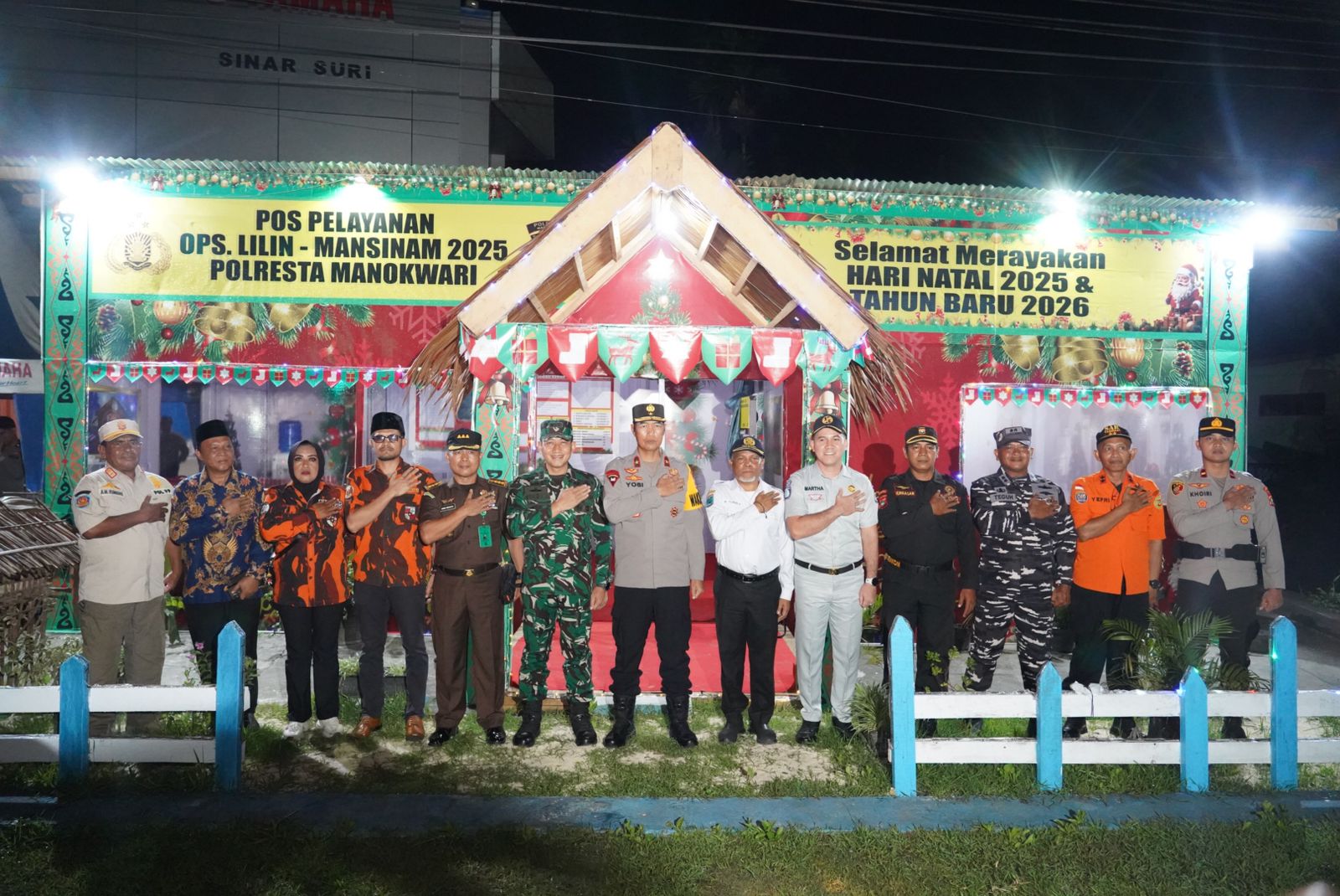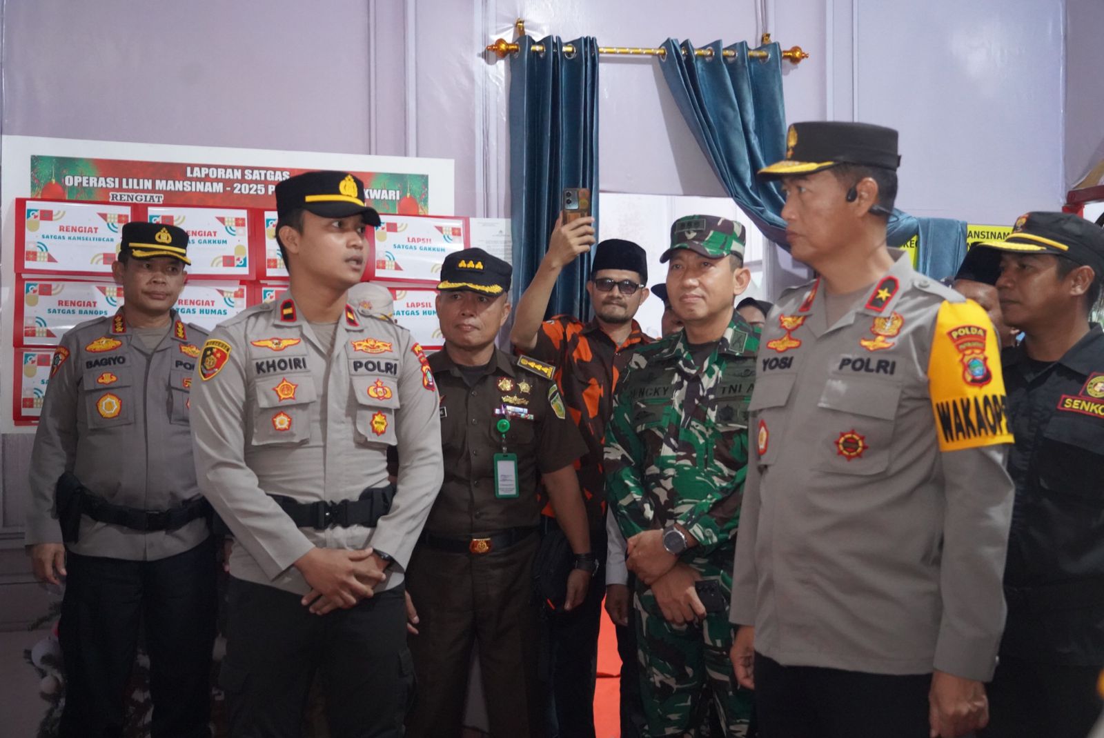 Kegiatan ini turut dihadiri oleh Wakapolda Papua Barat Brigjen Pol Drs. Yosi Muhamartha, Aspidmil Kejati Papua Barat Kolonel Laut (H) Ridho Sihombing, S.H., M.H. Kafasaharkan Manokwari Letkol Laut (T) Teguh Trilaksana, S.E., M.Tr.Opsla, Danramil 01 Kota/Kodim 1801 Manokwari Mayor Inf Arif Suwito, Kepala Dinas Kesehatan Provinsi Papua Barat Alwan Rimosan, Sp.B, FINACS, serta dinas terkait lainnya. Adapun peninjauan ini bertujuan untuk memastikan kesiapan personel, sarana prasarana, serta sinergitas lintas instansi dalam pelaksanaan pengamanan perayaan Natal dan Tahun Baru di wilayah Papua Barat.
