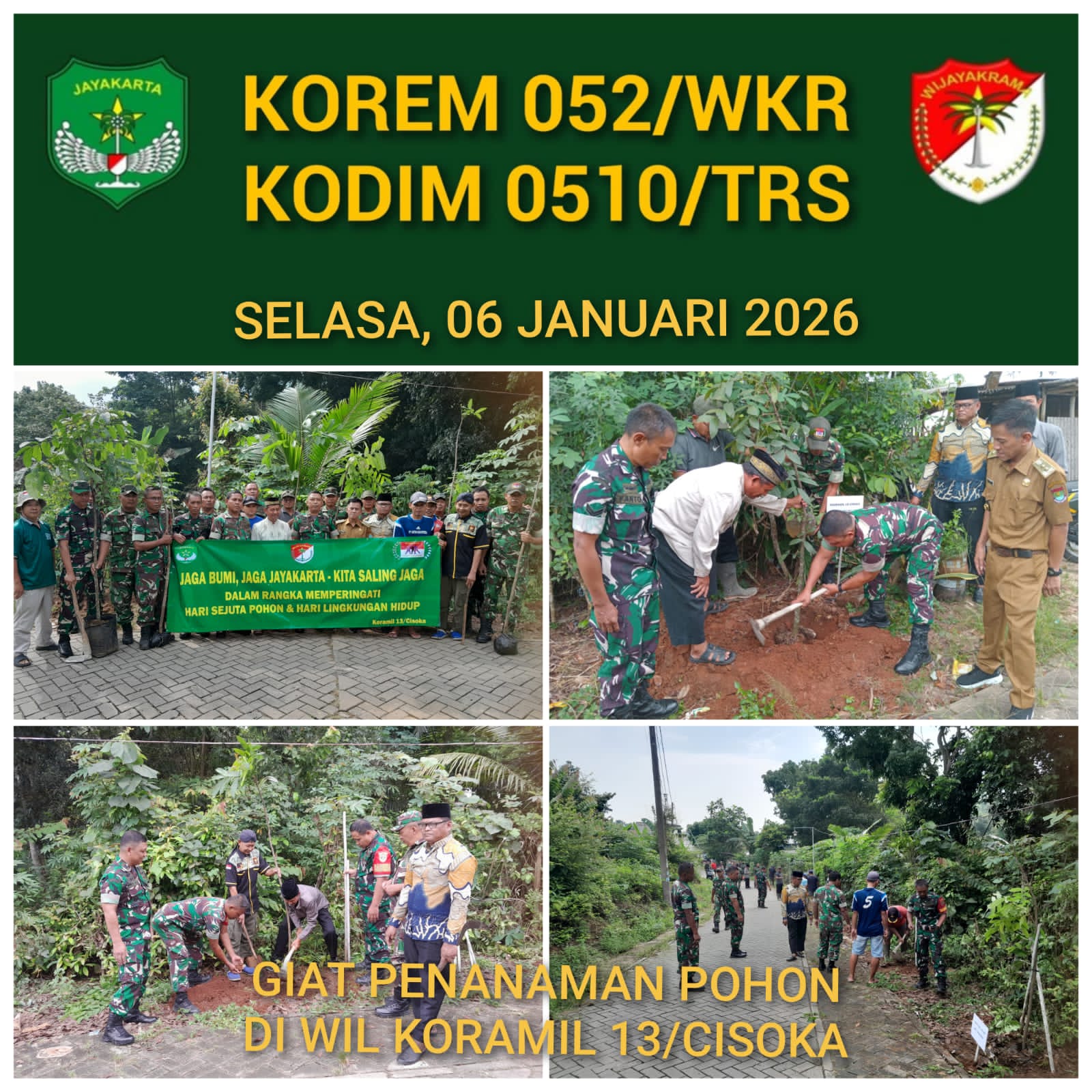 Danramil 13/Cisoka Kapten Inf Triyadi bersama Kepala Desa Munjul dan warga melaksanakan acara Hari Sejuta Pohon dan Lingkungan Hidup ,bertempat di Desa Munjul RT 06/01,Kecamaran Solear, Kabupaten Tangerang,Selasa 06 Januari 2026 Pukul 09.00 Wib s/d selesai .