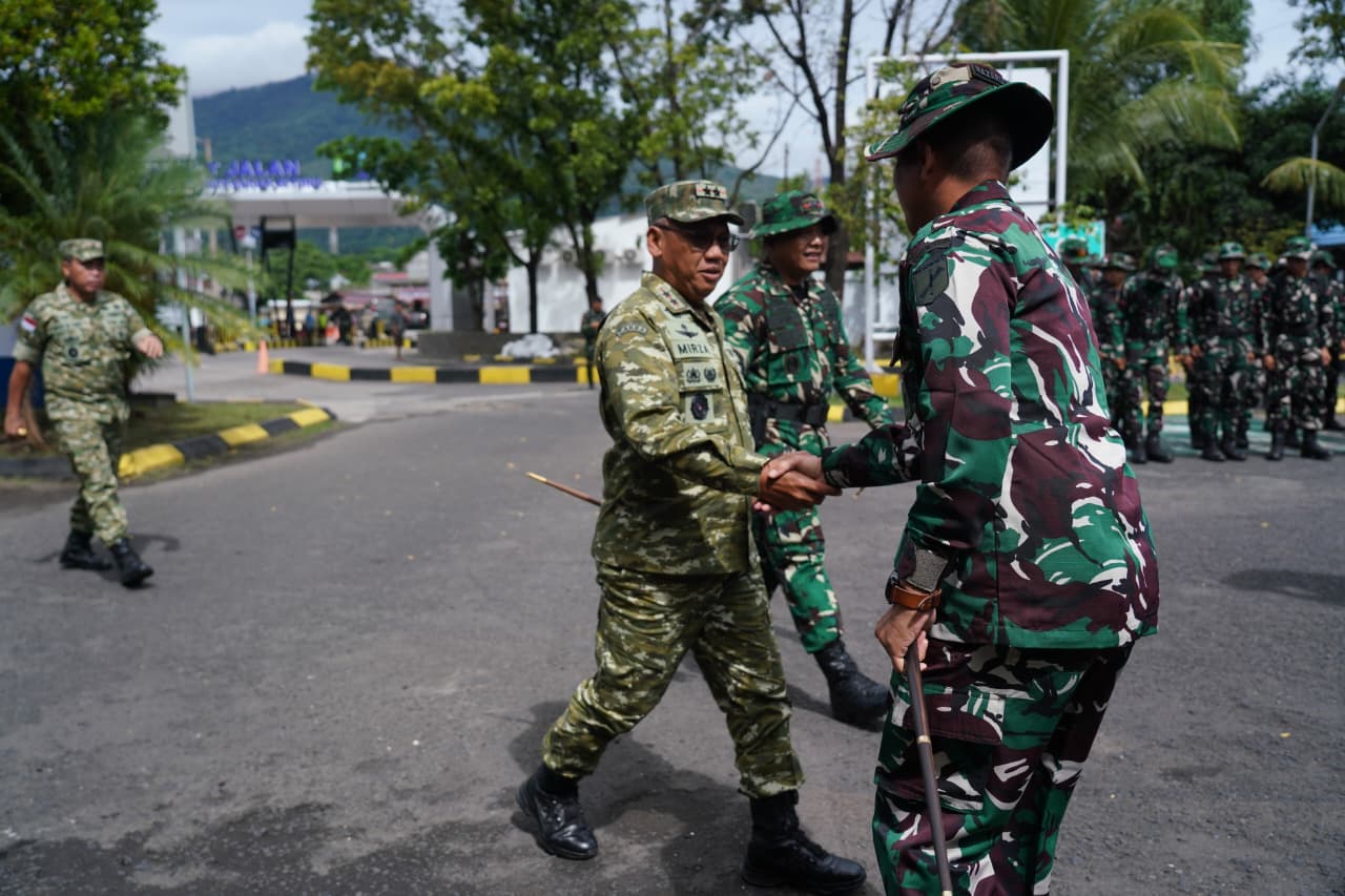 OKEBUNG | Panglima Kodam (Pangdam) XIII/Merdeka Mayjen TNI Mirza Agus, S.I.P melakukan pengecekan kesiapan serta pelepasan pasukan dalam rangka penanganan bencana alam yang terjadi di Kabupaten Kepulauan Sitaro langsung dari Pelabuhan Penyebrangan Kota Bitung. Selasa (6/1/2026)