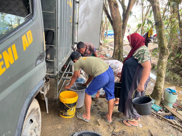 OKEBUNG | Satuan Tugas Prajurit Batalyon Zeni Tempur 10/JP/2 Kostrad menyalurkan air bersih kepada masyarakat pasca-bencana banjir bandang di posko-posko pengungsian yang terletak di Kabupaten Aceh Tamiang, Minggu (04/01/2026).