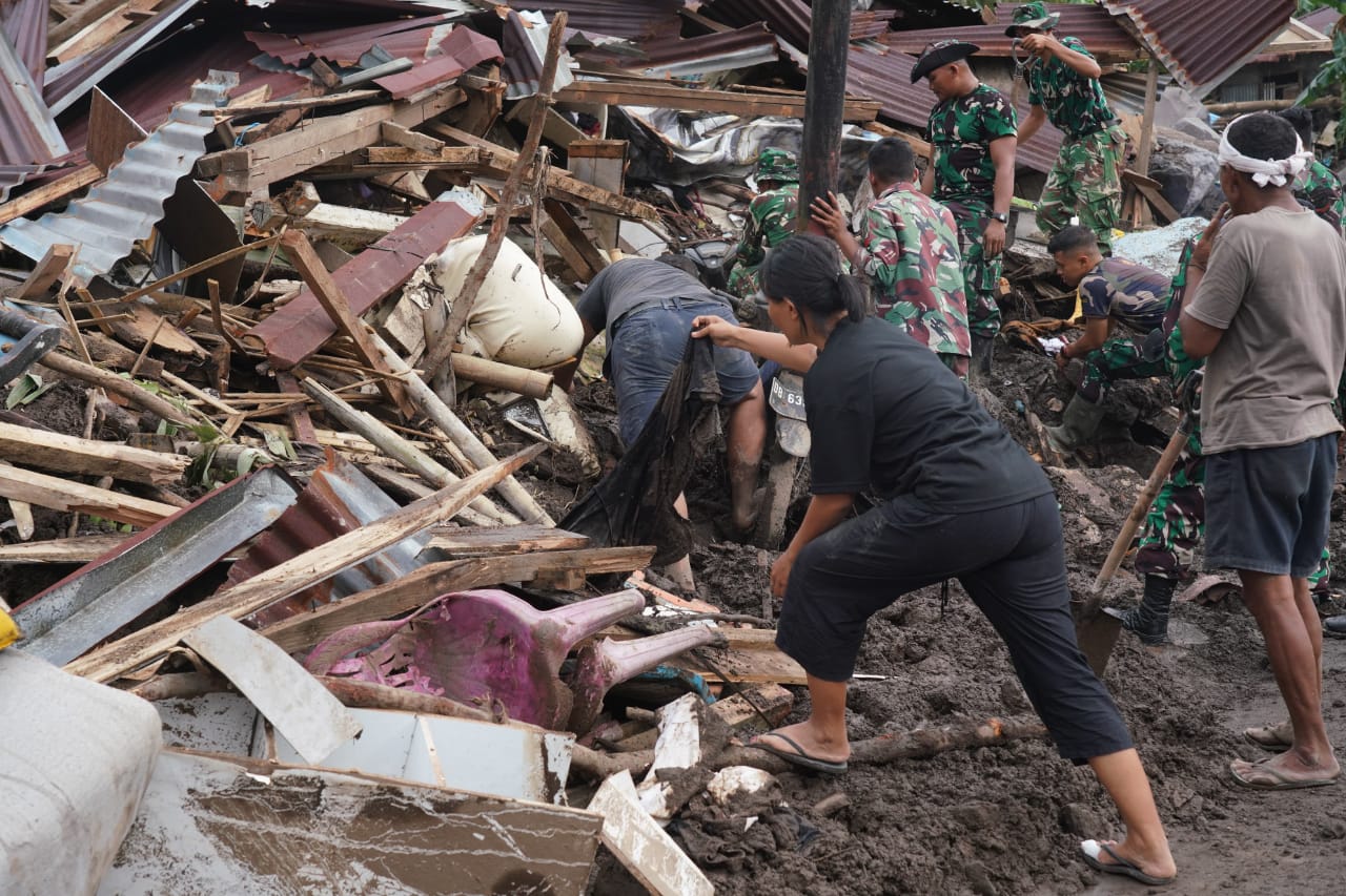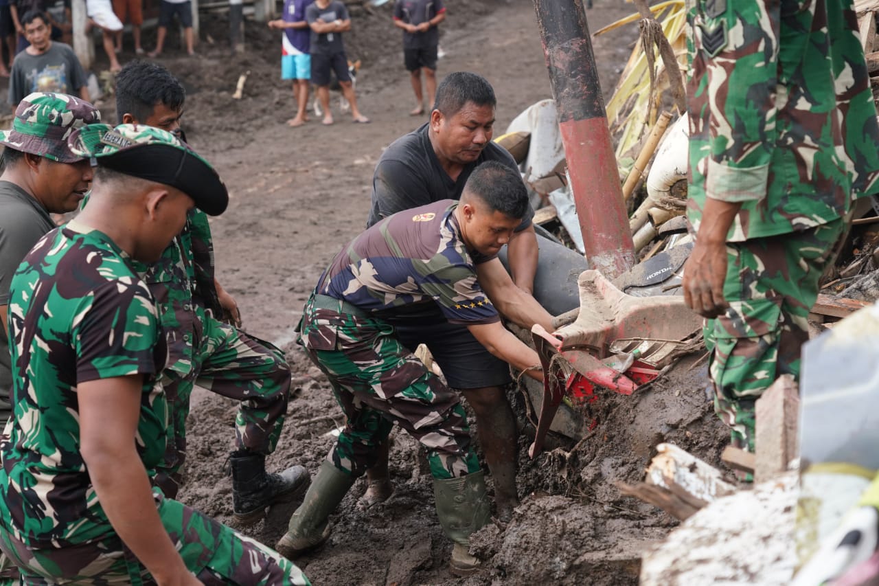 Prajurit Kodam XIII/Merdeka Bersama Masyarakat Berjibaku dalam Pembersihan Pascabencana di Desa Tanaki