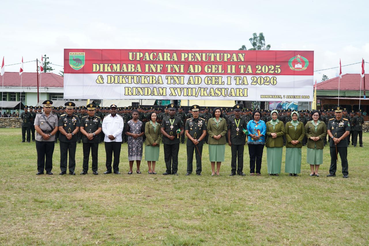 Mansel. kasuari18-tniad.mil.id – Selamat dan sukses kepada seluruh prajurit yang dilantik. Pelantikan ini merupakan peristiwa penting dan bersejarah sebagai titik awal pengabdian kepada negara merupakan penyampaian Pangdam XVIII/Kasuari Mayjen TNI Christian Kurnianto Tehuteru saat memimpin Upacara Penutupan Pendidikan Pertama Dikmaba If TNI AD Gelombang II TA 2025, dan Pendidikan Pembentukan Diktukba TNI AD Gelombang I TA 2026, di Lapangan Upacara Mako Rindam XVIII/Kasuari, Rabu (7/1/2026).