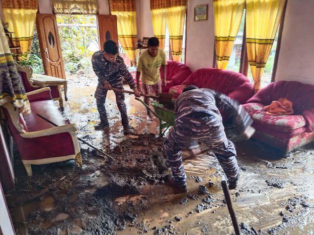 TNI AL GOTONG ROYONG BANTU MASYARAKAT TERDAMPAK BENCANA BANJIR BANDANG DI KABUPATEN SIAU