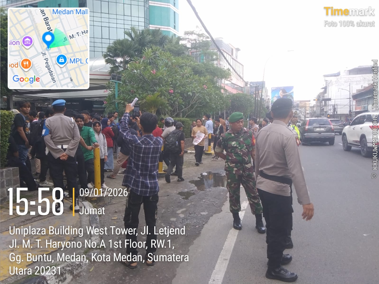 Medan – Babinsa Kelurahan Gang Buntu Koramil 0201-02/MT, Serka Purwanto, melaksanakan monitoring kegiatan aksi unjuk rasa yang digelar oleh aliansi Cipayung Plus Sumatera Utara pada Jumat, 9 Januari 2026. Kegiatan tersebut berlangsung mulai pukul 15.30 WIB hingga selesai di Kantor Konsulat Amerika Serikat yang berlokasi di kawasan Uniland, Jalan Irian Barat/MT Haryono, Kelurahan Gang Buntu, Kecamatan Medan Timur.