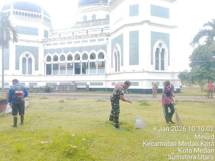 Medan Kota – Dalam rangka menjaga kebersihan lingkungan dan fasilitas ibadah, Babinsa Koramil 0201-04/Medan Kota, Sertu Mardi Fs, bersama warga melaksanakan gotong royong membersihkan Masjid Raya Al Mashun di Jalan Masjid Raya No. 1, Kelurahan Masjid, Kecamatan Medan Kota, Jumat (09/01/2026).