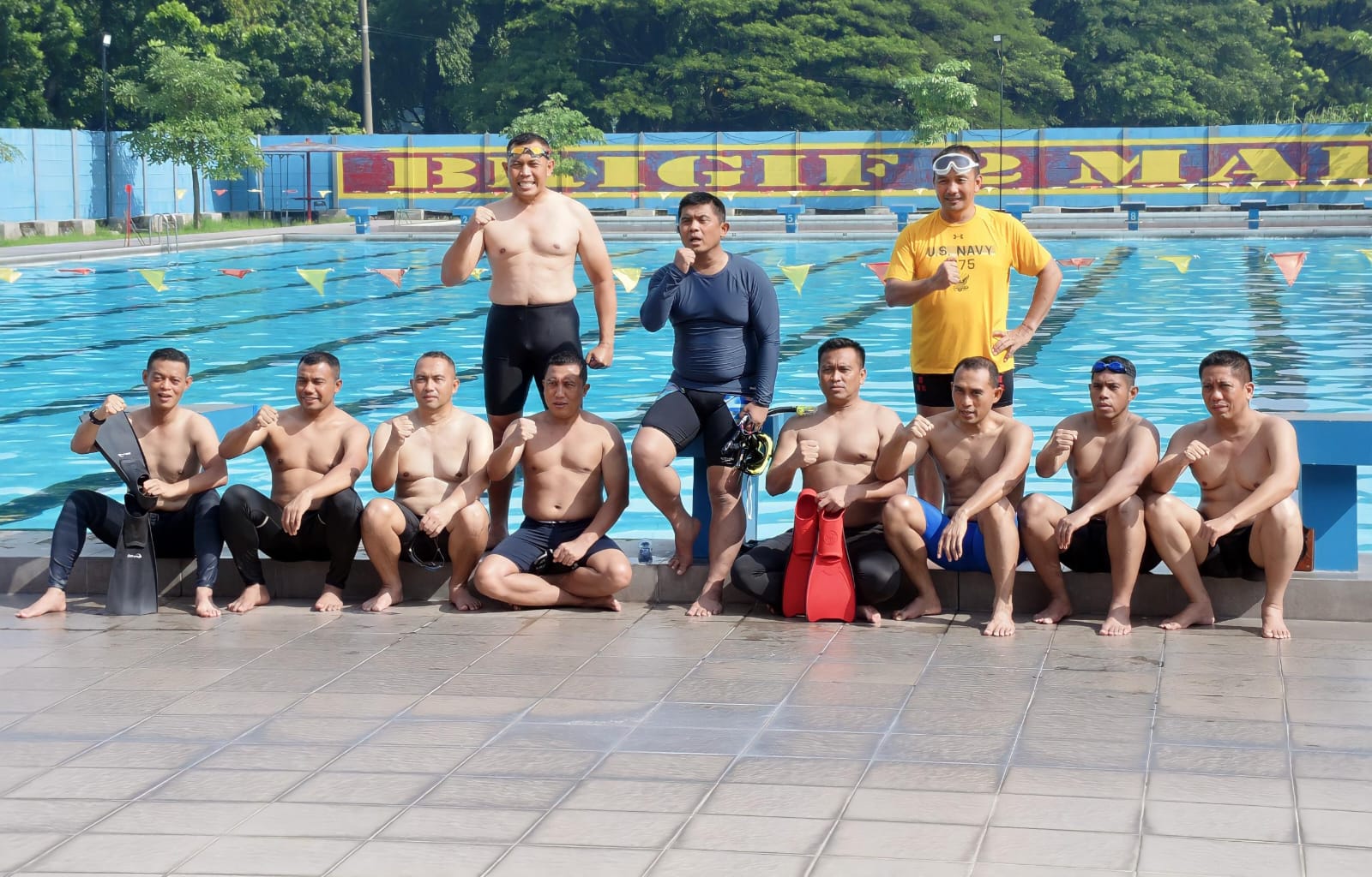 Dispen Kormar, TNI AL (Sidoarjo). Komandan Pasmar 2 Mayjen TNI (Mar) Dr. Oni Junianto bersama para Pejabat Utama (PJU) Pasmar 2 melaksanakan renang 1500 meter, di Kolam Renang Militer Tirto Sagoro-14, Kesatrian Marinir R. Suhadi, Gedangan, Sidoarjo Jumat (09/01).