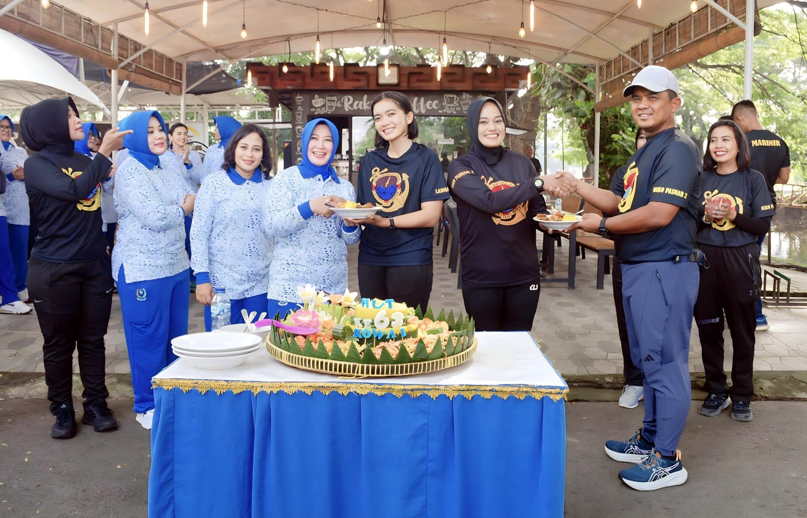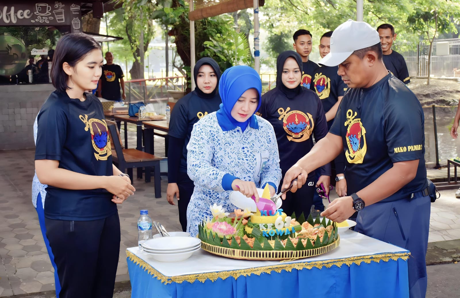Dispen Kormar, TNI AL (Sidoarjo). Dengan penuh semangat dan suasana keakraban, Komandan Pasmar 2 Mayjen TNI (Mar) Dr. Oni Junianto didampingi Ketua Korcab Pasmar 2 Gabungan Jalasenastri Korps Marinir Ny. Dian Oni Junianto, memberikan surprise kepada para srikandi laut Pasmar 2 berupa pemotongan tumpeng memperingati HUT ke 63 Kowal di Raksa Coffee Kesatrian Marinir Moekijat, Mako Pasmar 2 Gedangan, Sidoarjo. Kamis (08/01)