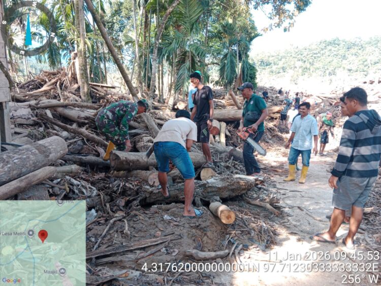 Aceh Timur – Serda Suriadi, Babinsa Koramil 10/Simpang Jernih Kodim 0104/Aceh Timur, bersama masyarakat melaksanakan kegiatan gotong royong membersihkan jalan umum pasca banjir yang mengarah ke sungai/pelabuhan, bertempat di Desa Melidi, Kecamatan Simpang Jernih, Kabupaten Aceh Timur, Senin (12/01/2026).