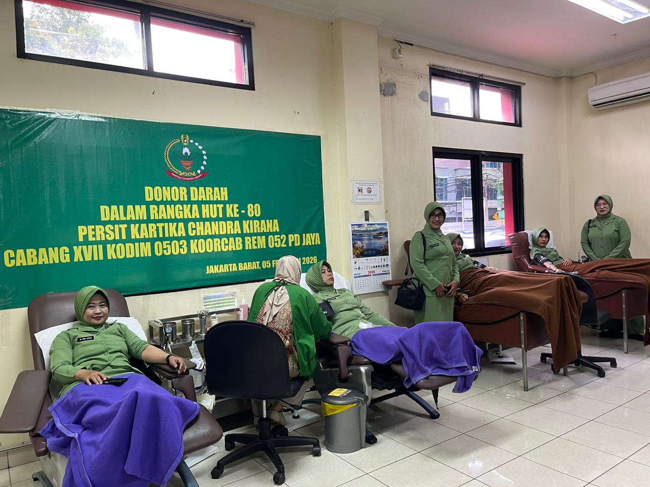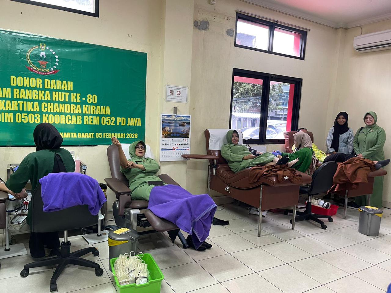 Dalam rangka memperingati hari ulang tahun (HUT) ke-80 ,Persit Kartika Chandra Kirana (KCK) Dim 0503/JB Koorcab Rem 052 PD Jaya melaksanakan aksi kemanusian donor darah ,Kamis, 5 Februari 2025,pagi bertempat di Kantor PMI Jl. Perdana No. 12, RT. 01/01 Kel. Wijaya Kusuma,Kec. Grogol petamburan, Kota Adm Jakarta Barat.