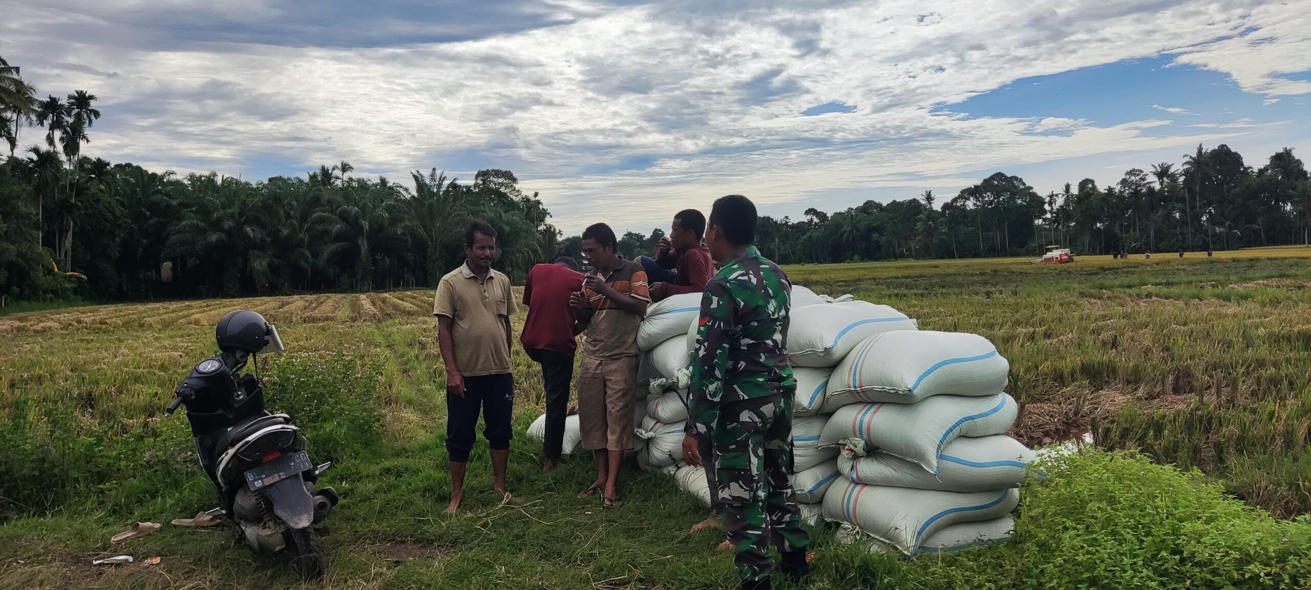OKEBUNG – Babinsa Koramil 04/Susoh Kodim 0110/Abdya Koptu Marzuki mendampingi para petani binaan pelansiran hasil panen padi di pesawahan Desa Gadang, Kecamatan Susoh, Jumat (6/2/2026).