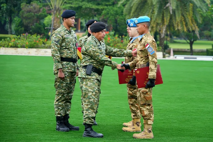 Satuan Tugas Maritime Task Force (MTF) TNI Kontingen Garuda (Konga) XXVIII-P UNIFIL TA. 2024/2025 menerima penghargaan Satyalencana Santi Dharma setelah mengemban misi perdamaian di bawah Perserikatan Bangsa-Bangsa (PBB).