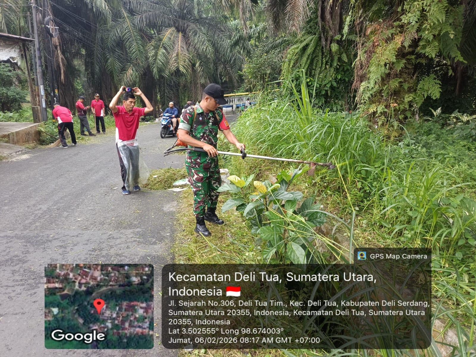 Delitua – Babinsa Koramil 15/DT Kodim 0201/Medan, Serka Heru, Serda Asril ,Tampak Semangat Melaksankan Gotong Royong Bersama Perangkat Kecamatan Deli Tua, Para Stap Desa Mekar Sari dan Warga Masyarakat membersihkan rumput yang tumbuh di bahu/pinggir jalan di Desa Mekar sari Jln Sejarah Baru, Kecamatan Deli Tua, Kabupaten Deli Serdang, Jum, at (06/02/2026).