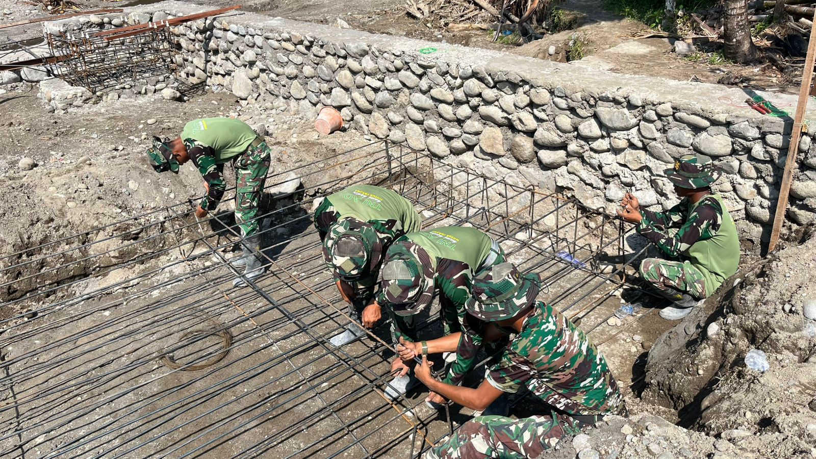 Pada tahapan pekerjaan hari ini, personel gabungan memfokuskan kegiatan pada perakitan besi pondasi dudukan braket atau angker tonggak jembatan. Proses pengerjaan dilakukan secara teliti dan penuh kehati-hatian guna memastikan pondasi yang dibangun memiliki kekuatan serta ketahanan yang optimal, sehingga jembatan nantinya dapat digunakan dalam jangka waktu lama serta aman dilalui masyarakat.