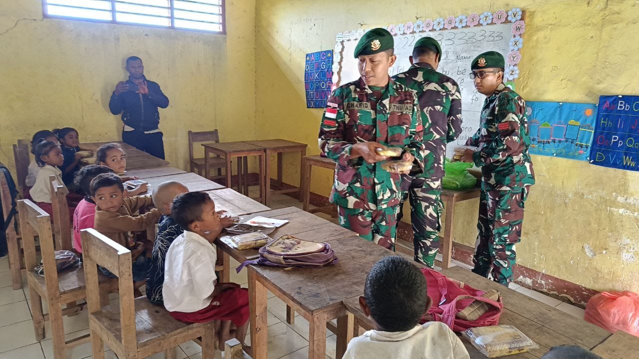 Tasinifu – Wujud kepedulian terhadap generasi muda di wilayah perbatasan kembali ditunjukkan oleh personel Satgas Pamtas RI–RDTL Sektor Barat dari Pos Oelbinose yang berbagi makanan bergizi gratis kepada anak-anak di SD Kecil Oelmuke, Desa Tasinifu, Kecamatan Mutis, Kabupaten Timor Tengah Utara (TTU). Kamis (19/08/2026).