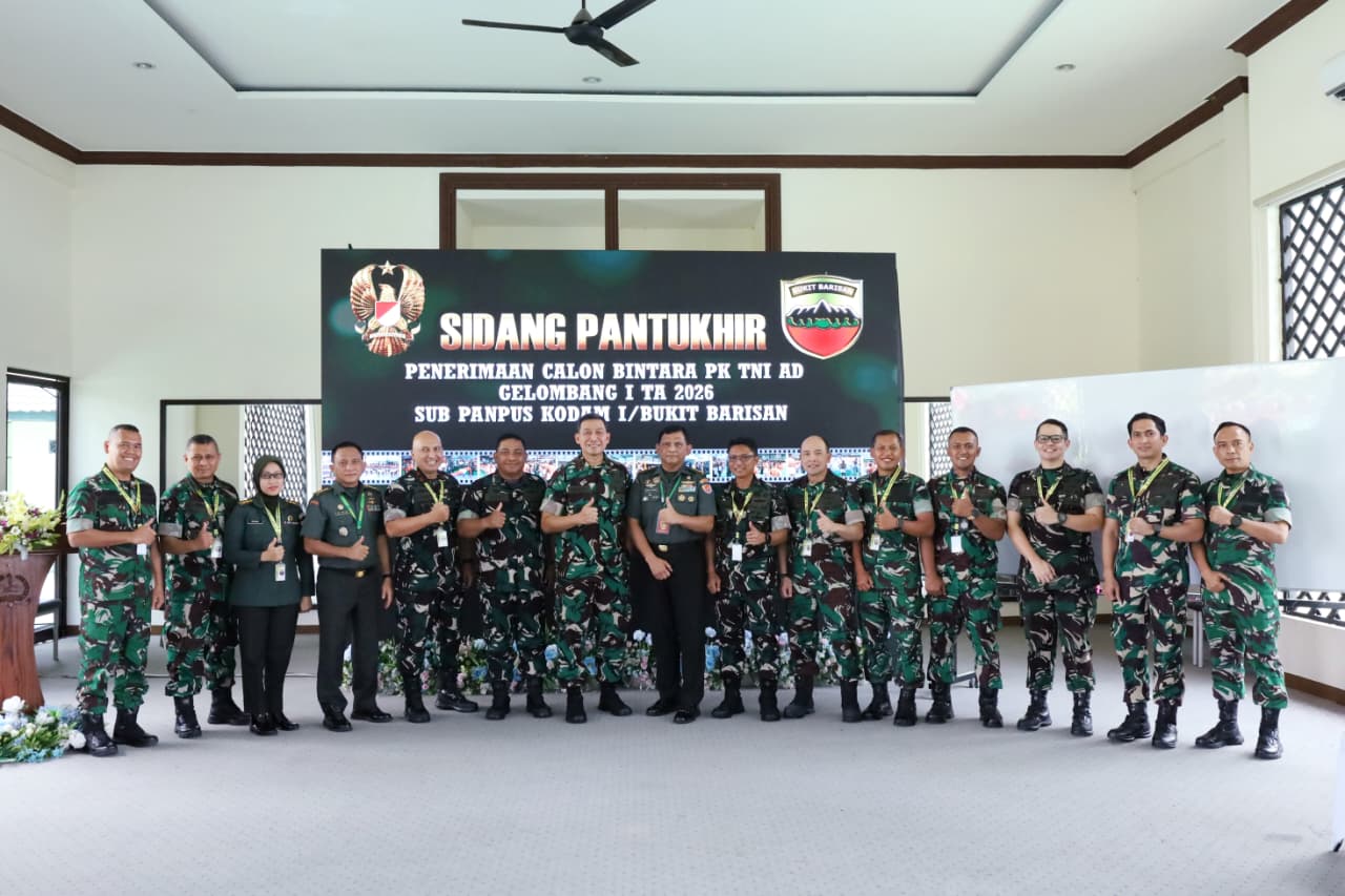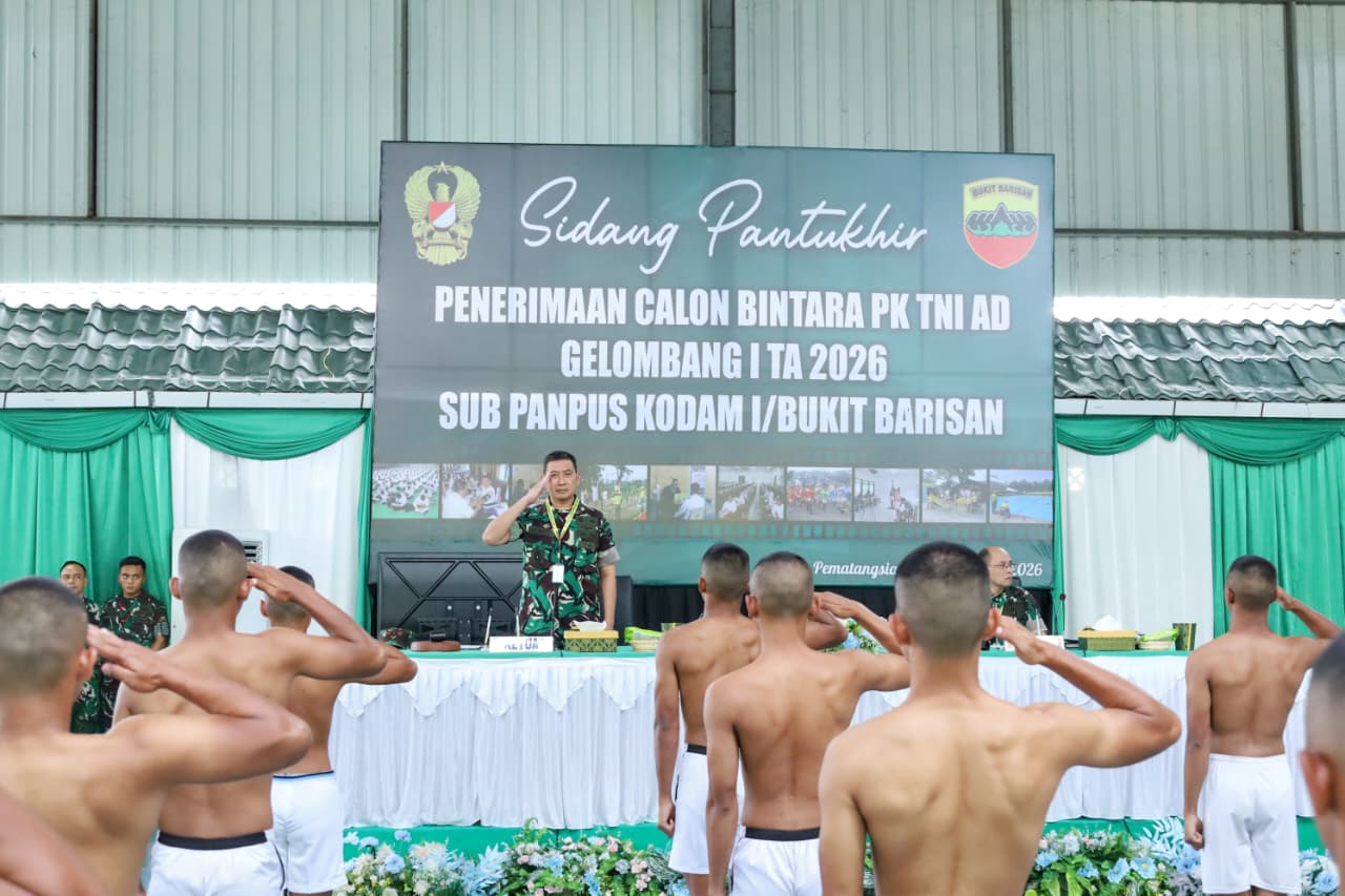 Pematangsiantar – Pangdam I/Bukit Barisan Mayjen TNI Hendy Antariksa memimpin kegiatan Sidang Pantukhir Pusat Penerimaan Calon Bintara (Caba) PK TNI AD Gelombang I TA 2026 tingkat Sub Panpus Kodam I/BB di Lapangan Tennis Indoor Rindam I/BB, Pematangsiantar, Kamis (19/2/2026). Setibanya di Rindam I/BB, Pangdam menerima laporan dan penghormatan jajar sebelum kegiatan dimulai.
